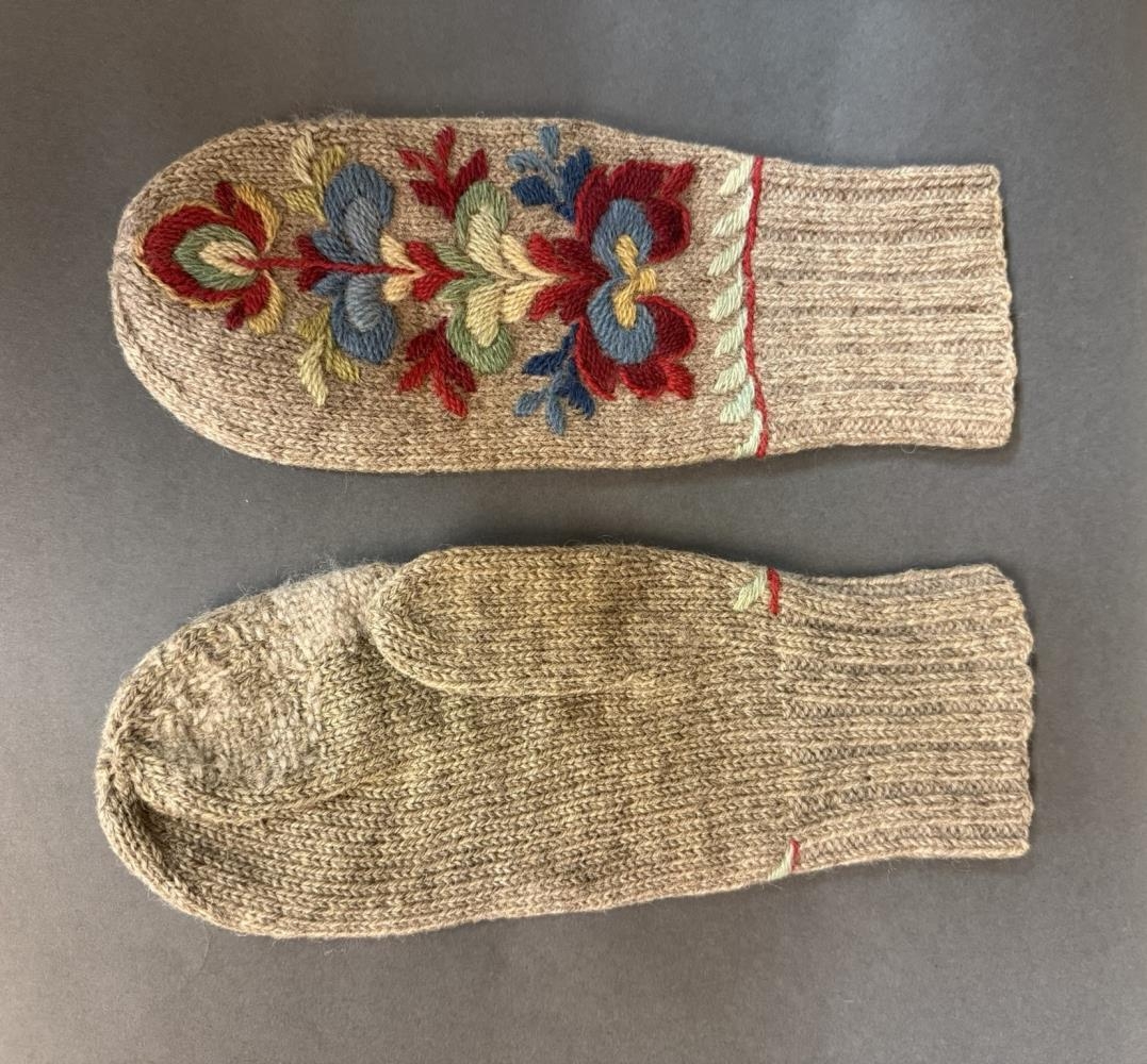 Vettlingar úr gráu ullarbandi, slitnir og ístoppaðir, einþumla. Handarbök skrautlega útsaumuð og kann munstrið að vera að norskri fyrirmynd. Verk Guðríðar Kristófersdóttur.