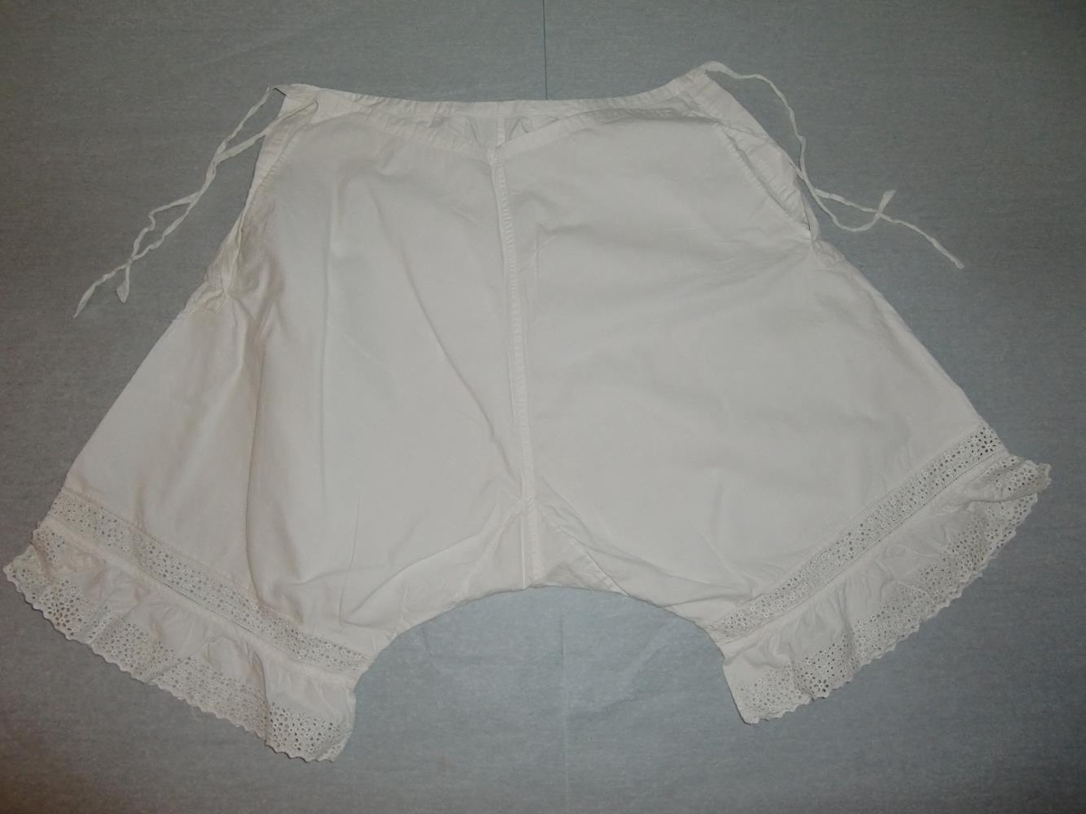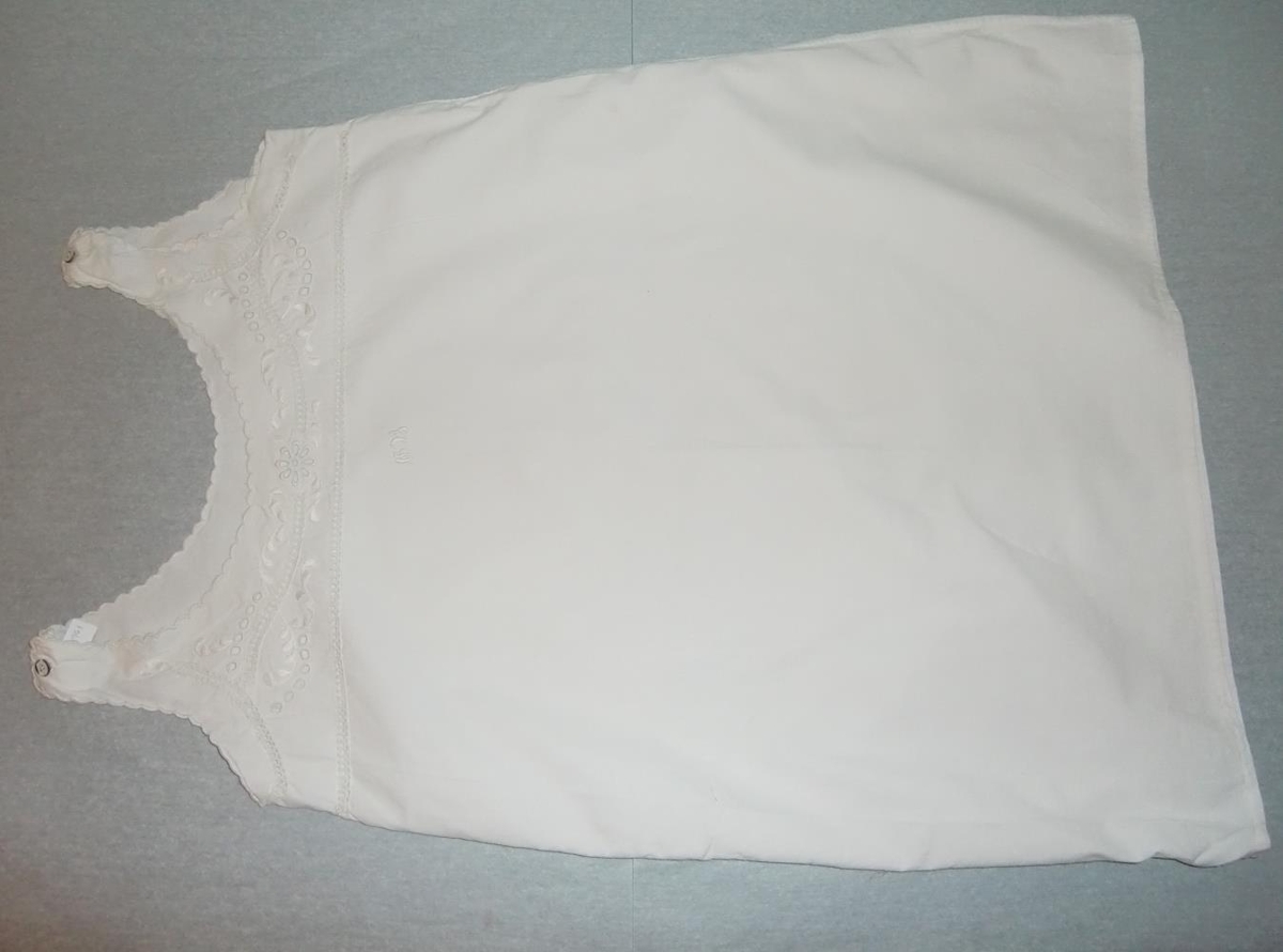 Undirföt Guðríðar Bonnesen (Kristófersd.), saumuð af henni í æsku, gerð úr lérepti með útsaumuðum líningum (hvítsaumur) og ísaumuðu fangamarki. Þetta er skyrta og buxur.