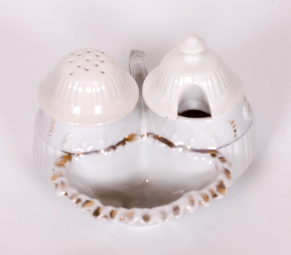 Hvítur postulíns salt- og piparstaukur með gyllingu. Staukarnir eru fastir saman og örlítil skál fyrir framan þá og hald.