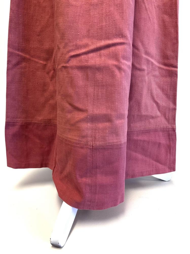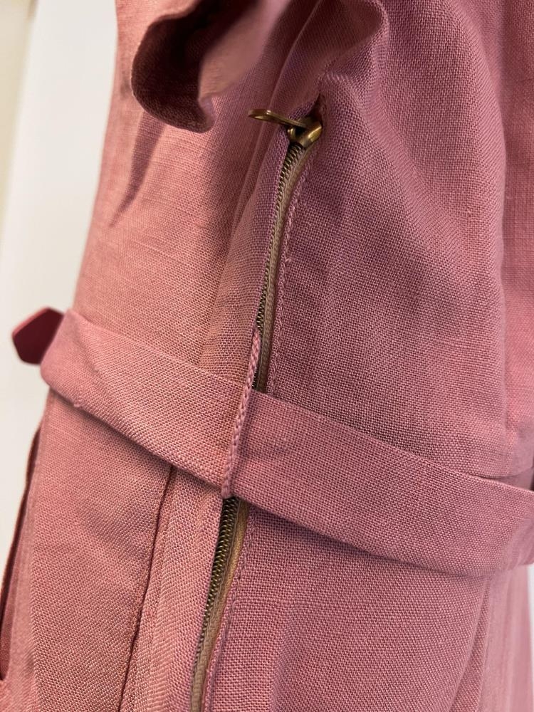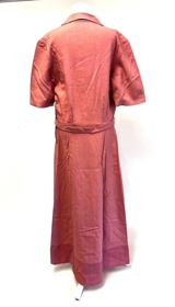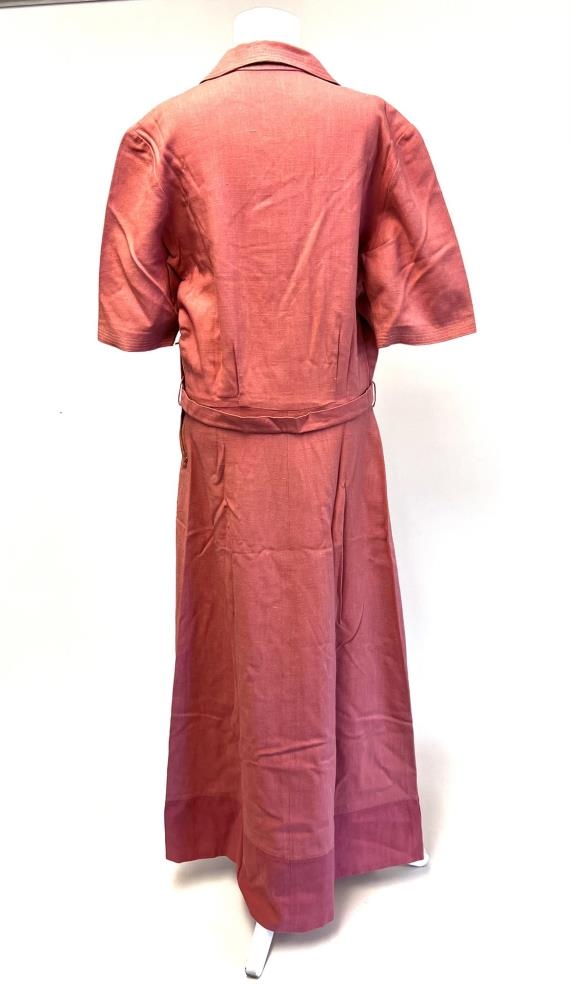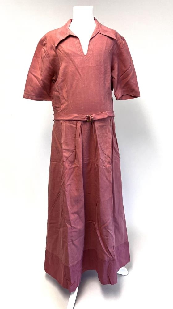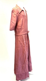 Bleikur kjóll sem María saumaði á Laugalandi, 1947-1948. Kjóllinn er síður, um 125 cm á lengd. Rennilás í mitti til hliðar. Nett belti úr sama efni og gylltum hringjum sem festa saman. Stórir vasar. Oddmjór kragi og kvartermar.