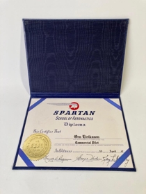 Prófskírteini Arnar Eiríkssonar frá bandaríska flugskólanum Spartan School of Aeronautics. Örn lauk atvinnuflugmannsprófi 14. apríl 1947. Skírteinið er blátt að lit og á því stendur með gylltum stöfum: Spartan School of Aeronautics Tulsa, Okla.. Þar fyrir ofan er merki skólans.