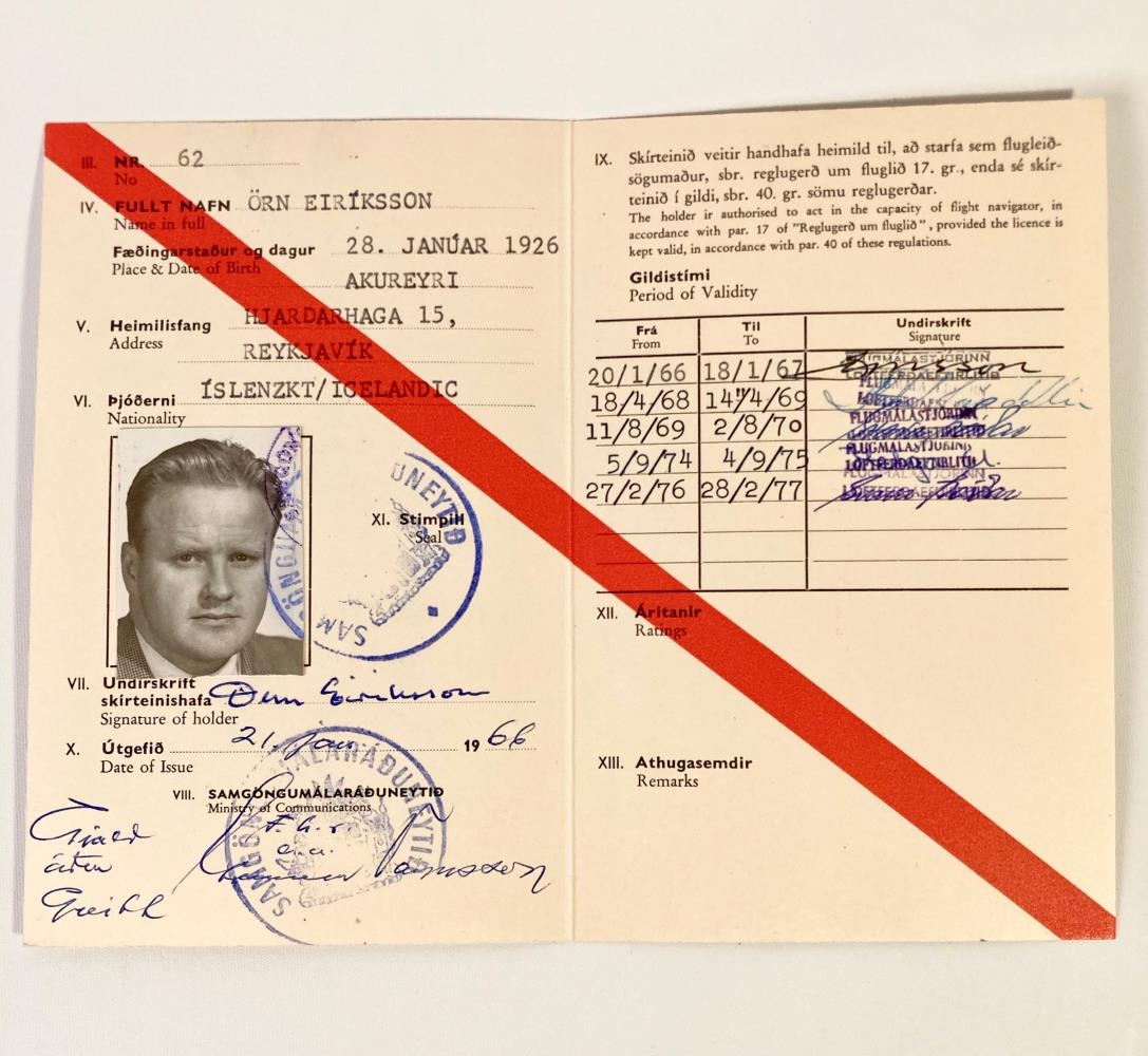 Skírteini Arnar Eiríkssonar loftsiglingafræðings og flugumsjónarmanns hjá Flugfélagi Íslands, síðar Flugleiðum og Icelandair. Á skírteininu stendur: Skírteini flugleiðsögumanns. Flight Navigator's Licence og er gefið út af Samgöngumálaráðuneytinu 21. janúar 1966. Skírteinið er hvítt að lit með rauðri rönd og er í plastvasa.