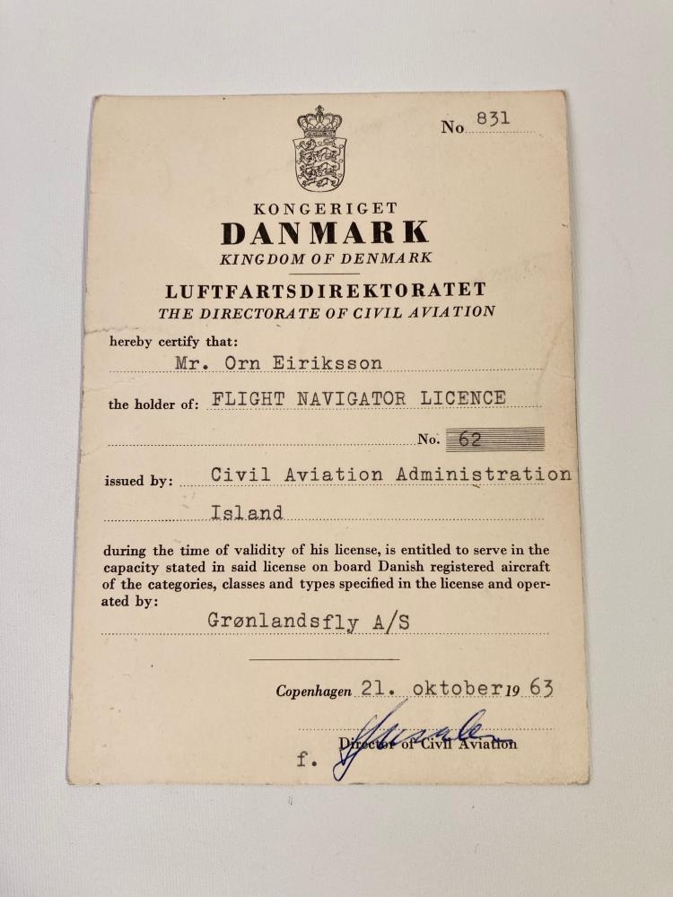Danskt flugleiðsögumannsskírteini Arnar Eiríkssonar loftsiglingafræðings og flugumsjónarmanns hjá Flugfélagi Íslands, síðar Flugleiðum og Icelandair. Skírteinið var gefið út af dönsku flugmálastjórninni og veitti Erni leyfi til þess að starfa um borð í flugvélum Grønlandsfly A/S sem skráðar voru í Danmörku. Skírteinið var gefið út 21. október 1963.