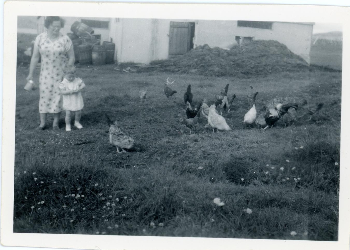 Til vinstri stendur fullorðin kona í blómakjól og barn fyrir framan hana. Hægra megin við þær er hænsnahópur sem virðist vera að éta. Fyrir aftan konuna sést hrúga af stórum tunnum upp við húsvegg. Til hægri er hurð og smá hóll þar fyrir framan og til hægri.