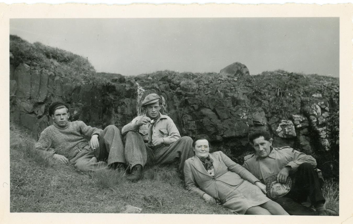 Fjórar manneskjur sitja í smá halla. Maðurinn lengst til vinstri er með dökkt höfuðfat og hálfliggur á handleggnum sínum. Hægra megin við hann situr ungur maður með kaskeiti og heldur á einhverju fyrir framan sig. Hægra megin við hann er kona sem hálfliggur á jörðinni, með gleraugu og í jakka og pilsi. Hægra megin við hana er berhöfðaður maður sem heldur á hatti. Fyrir aftan þau eru smá klettar og sést lítill foss renna niður á milli ungu mannanna til vinstri.