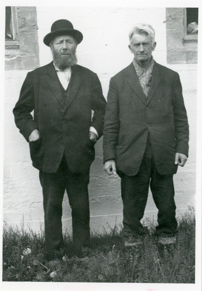 Tveir menn standa hlið við hlið fyrir utan húsvegg. Sitt hvoru megin við þá má sjá glitta í horn á gluggum. Maðurinn til vinstri er með hatt á höfði, mikið skegg og hendur í vösum á jakkanum sem hann klæðist. Maðurinn til hægri er berhöfðaður, mögulega með hálsklút, klæddur jakka og í skóm eða stígvélum sem eru reimuð aðeins upp.