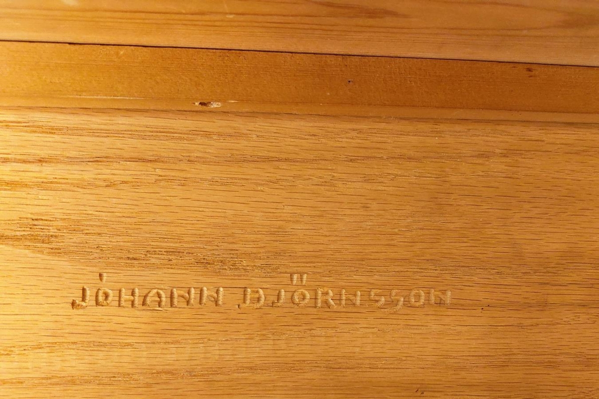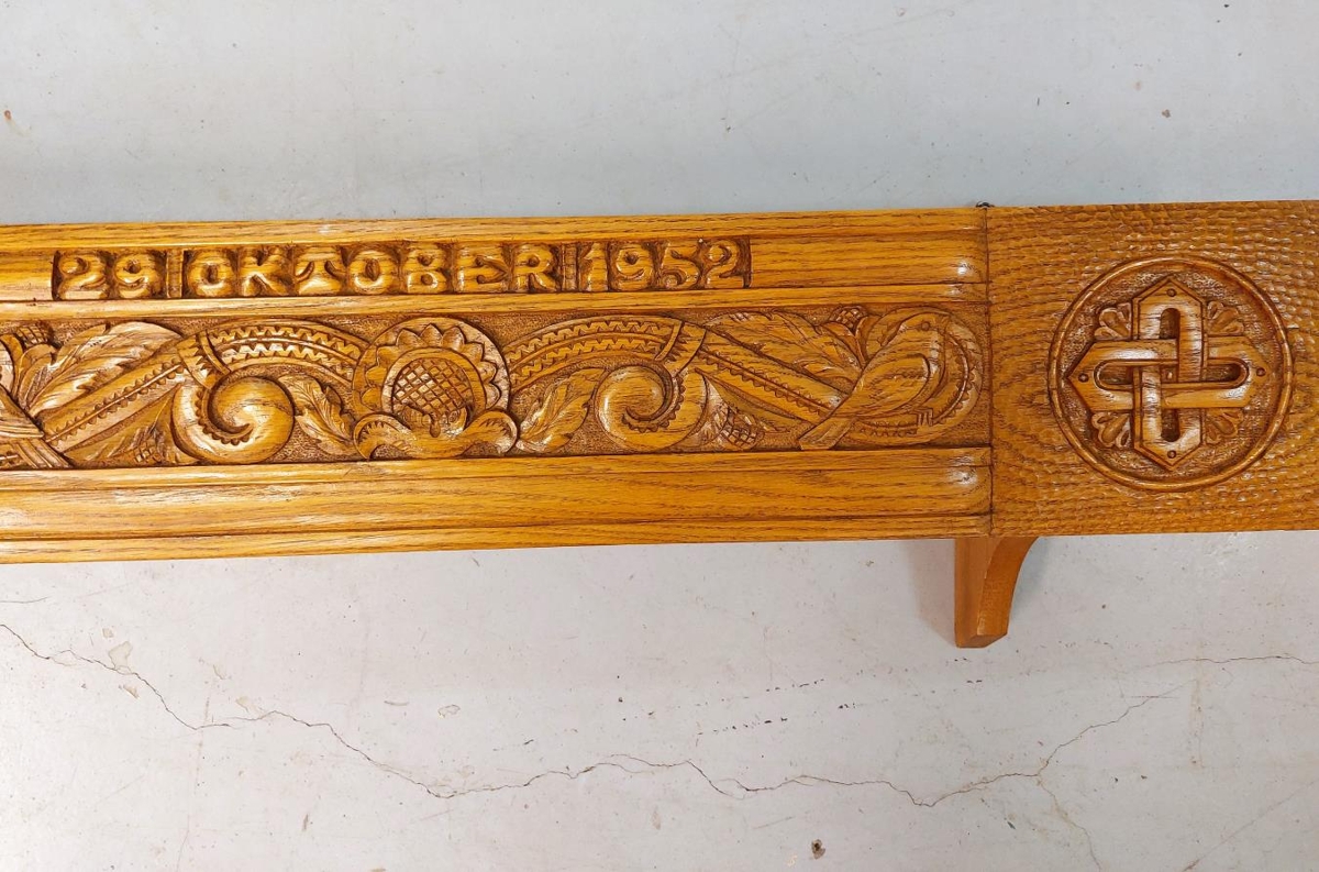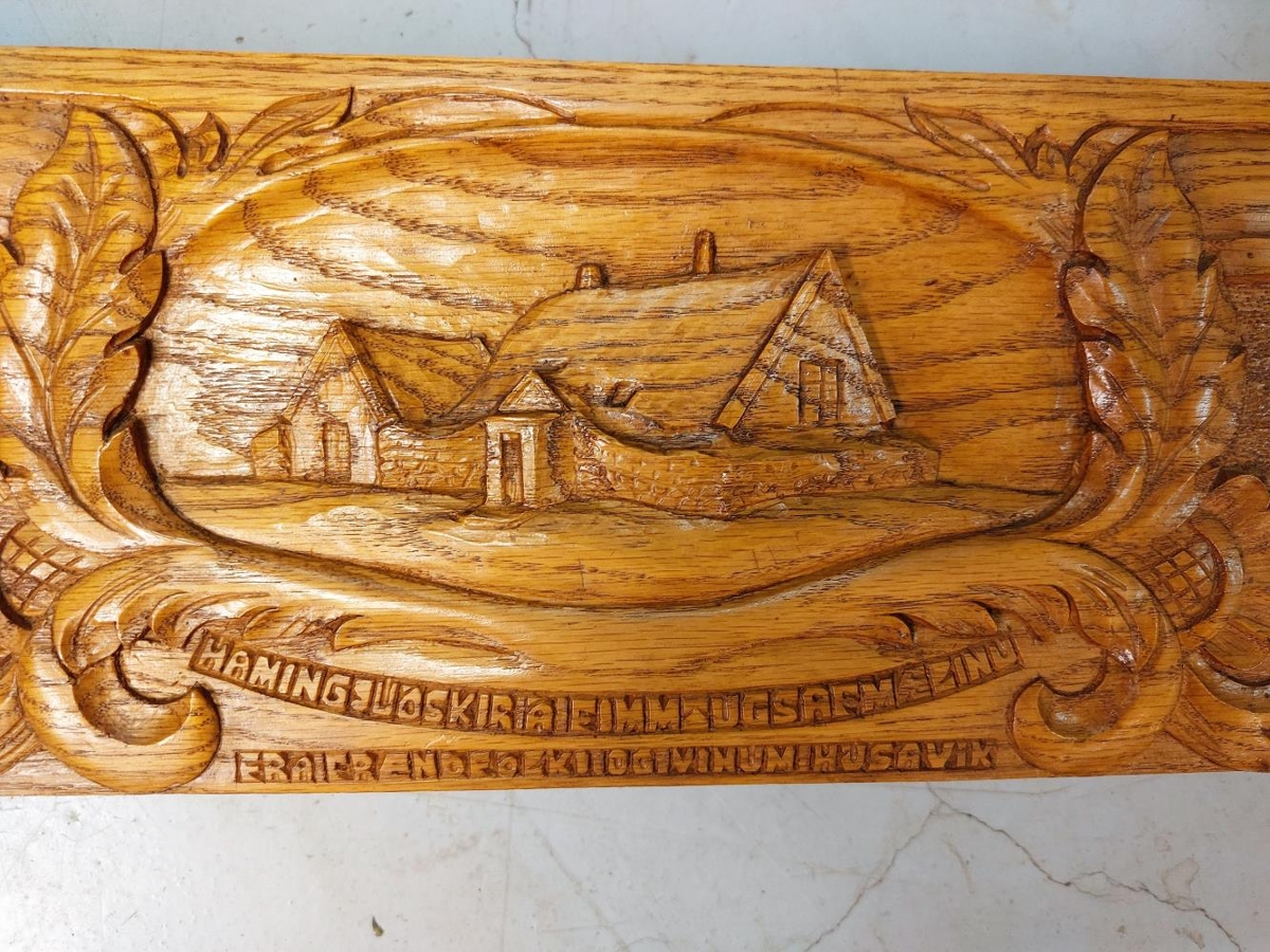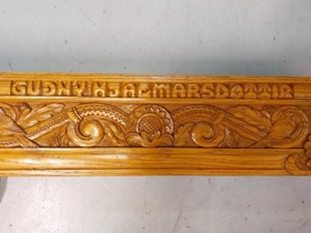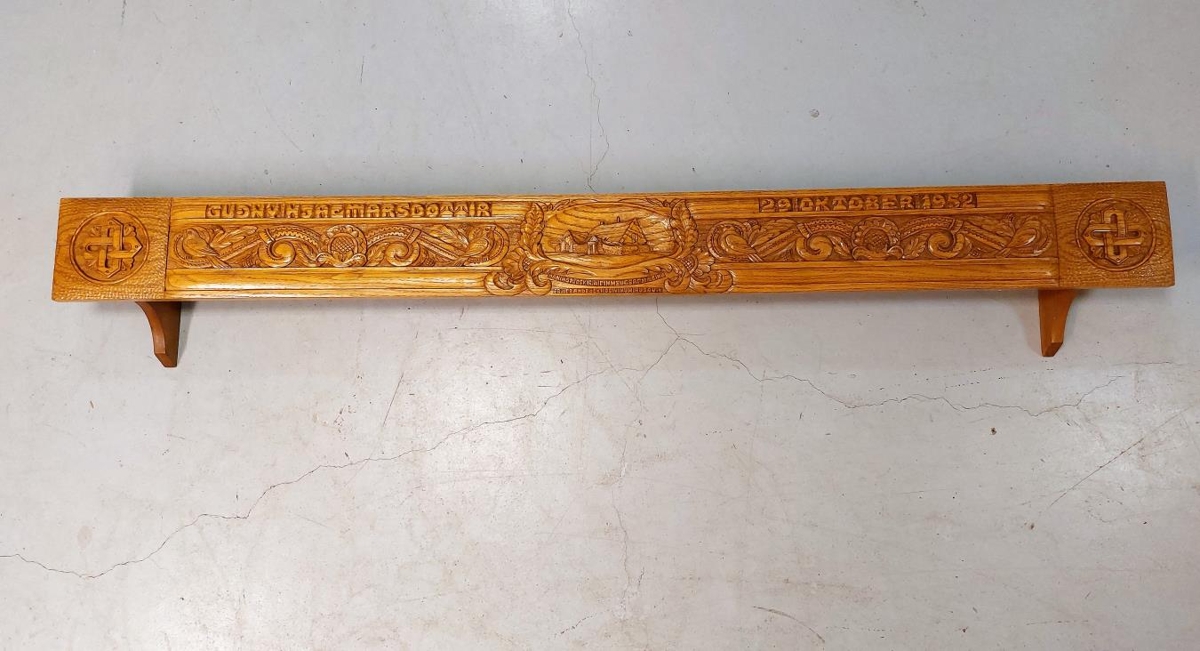 Útskorin vegghilla. Gerð af Jóhanni Björnssyni, útskurðarmeistara og er nafn hans skorið út á bakhlið hillunnar. Var gjöf til Guðnýjar Hjálmarsdóttur þegar hún varð fimmtug, 29, október 1952. Gefendur voru frændfólk og vinir á Húsavík. Á hillunni er útskorin mynd af Hallgrímsbæ, en það var torfbær á Húsavík þar sem Guðný bjó frá fæðingu og til 9 ára aldurs. Bærinn var reistur af móðurföður hennar.