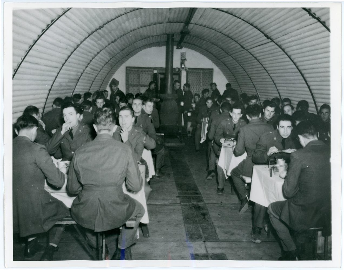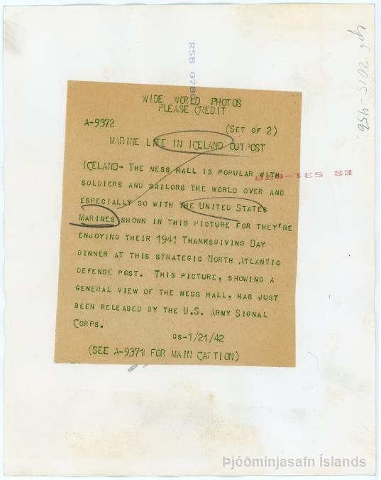 Fjöldi hermanna að snæðingi í matsal í bragga, líklega hærra settir hermenn eftir fatnaði þeirra að dæma. Á bakhlið er m.a. skrifað: Marine life in Iceland outpost.. GS-1/21/42. Sjá nánar undir Fylgiskjöl.