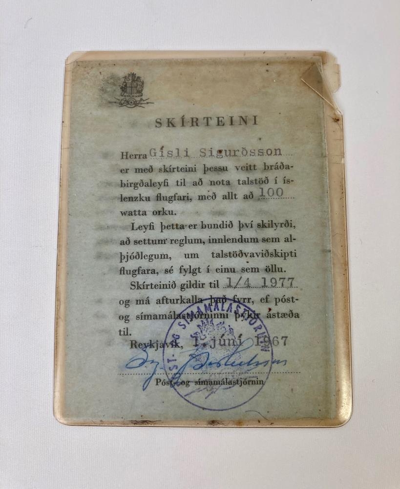 Skírteini Gísla Sigurðssonar flugvélasmiðs og svifflugmanns. Skírteinið var gefið út af Póst- og símamálastjórn 1. júní 1967 og veitti Gísla bráðabirgðaleyfi til að nota talstöð í íslensku flugfari. Skírteinið gilti til 1. apríl 1977. Skírteinið er ljósblátt að lit og er í plastvasa sem er orðinn rifinn og mattur.