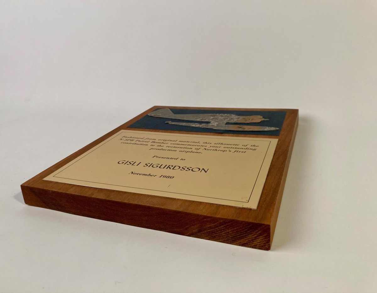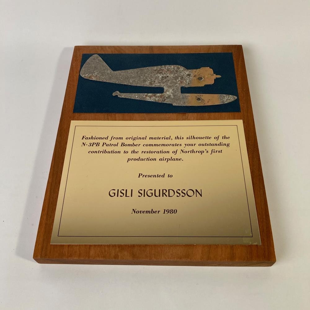 Veggskjöldurinn er úr viði og á honum er málmplata sem á stendur: Fashioned from original material, this silhouette of the N-3PB Patrol Bomber commemorates your outstanding contribution to the restoration of Northrop’s first production airplane. Presented to Gisli Sigurdsson November 1980. Fyrir ofan málmskjöldinn er dökkblá leðurpjatla sem á er fest skuggamynd (e. silhouette) af umræddri flugvél og er búin til úr málmi úr flugvélinni.