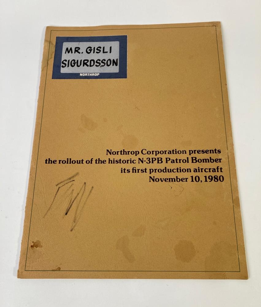 Boðskortið er brúnt að lit, í þríbroti, og á því stendur: Northrop Corporation presents the rollout of the historic N-3PB Patrol Bomber its first production aircraft November, 10. Í efra hægra horni er blár límmiði með nafni Gísla og undir því stendur Northrop.