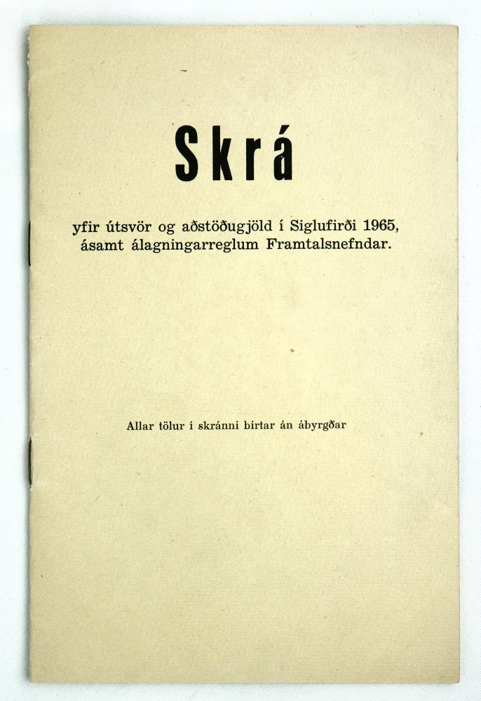Bæklingur sem ber nafnið Skrá yfri útsvör og aðstöðugjöld í Siglufirði 1965, ásamt álagningareglum Framtalsnefndar. Í bæklingnum er að finna upplýsingar um útsvar einstaklinga og fyrirtækja á Siglufirði árið 1965, aðstöðugjöld einstaklinga og fyrirtækja ásamt álagningarreglum Framtalsnefndar.