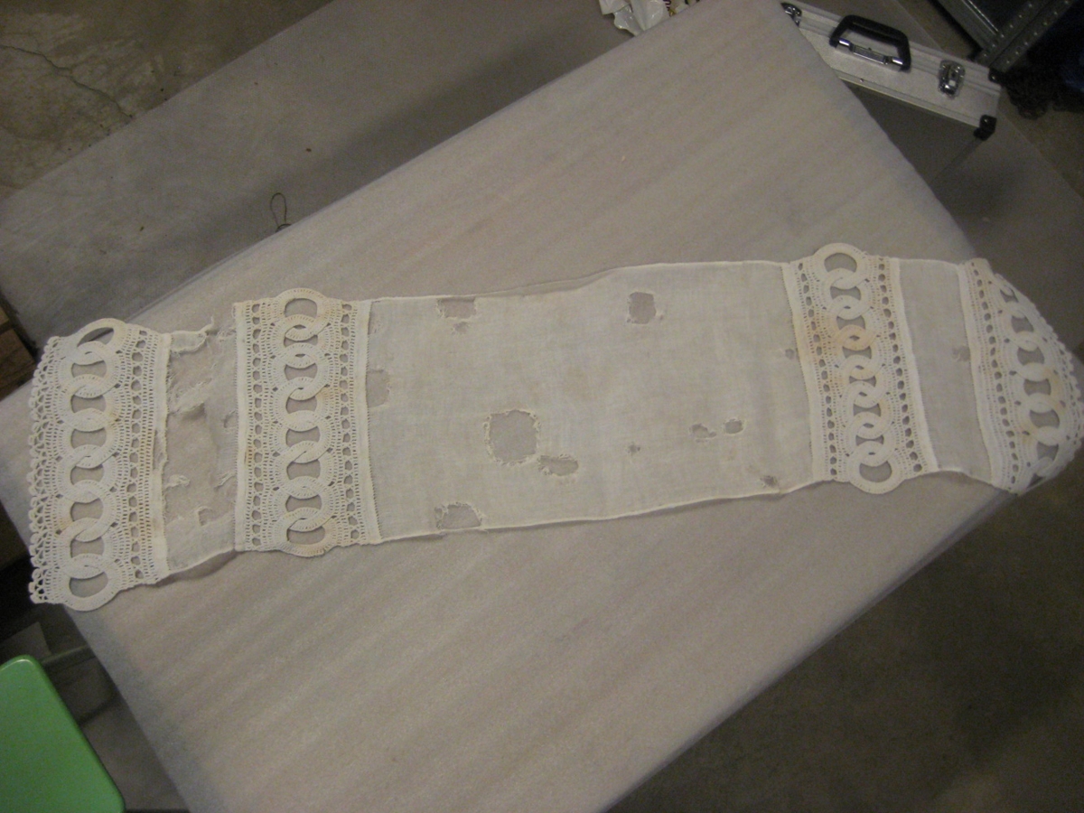 Hvítur dúkur með hekluðum endum og milliverki. Föt úr búi Sigríðar Þorleifsdóttur. Sigríður Kristín Guðmundsdóttir var kona Ingimars Jóhannes- sonar kennara í Keflavík. Ingimundur var áður tengdasonur Sigríðar Þorleifsdóttur á Háeyri á Eyrarbakka.