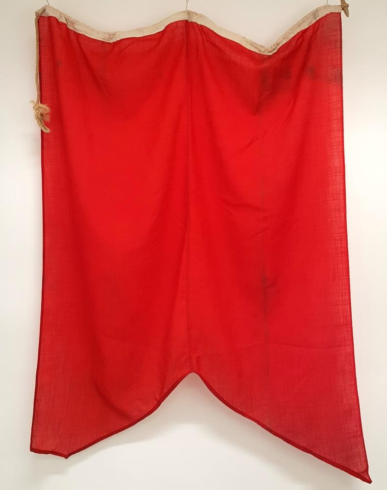 Fáni verkalýðsfélaga á Selfossi borinn 1. maí ár hvert. Eitt hornið var illa slitið af og saumað fyrir af Kristínu Guðmundsdóttur frá Kálfhóli á Skeiðum (20.11.1989).