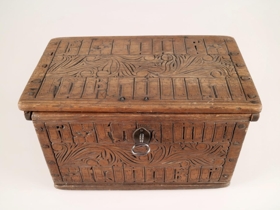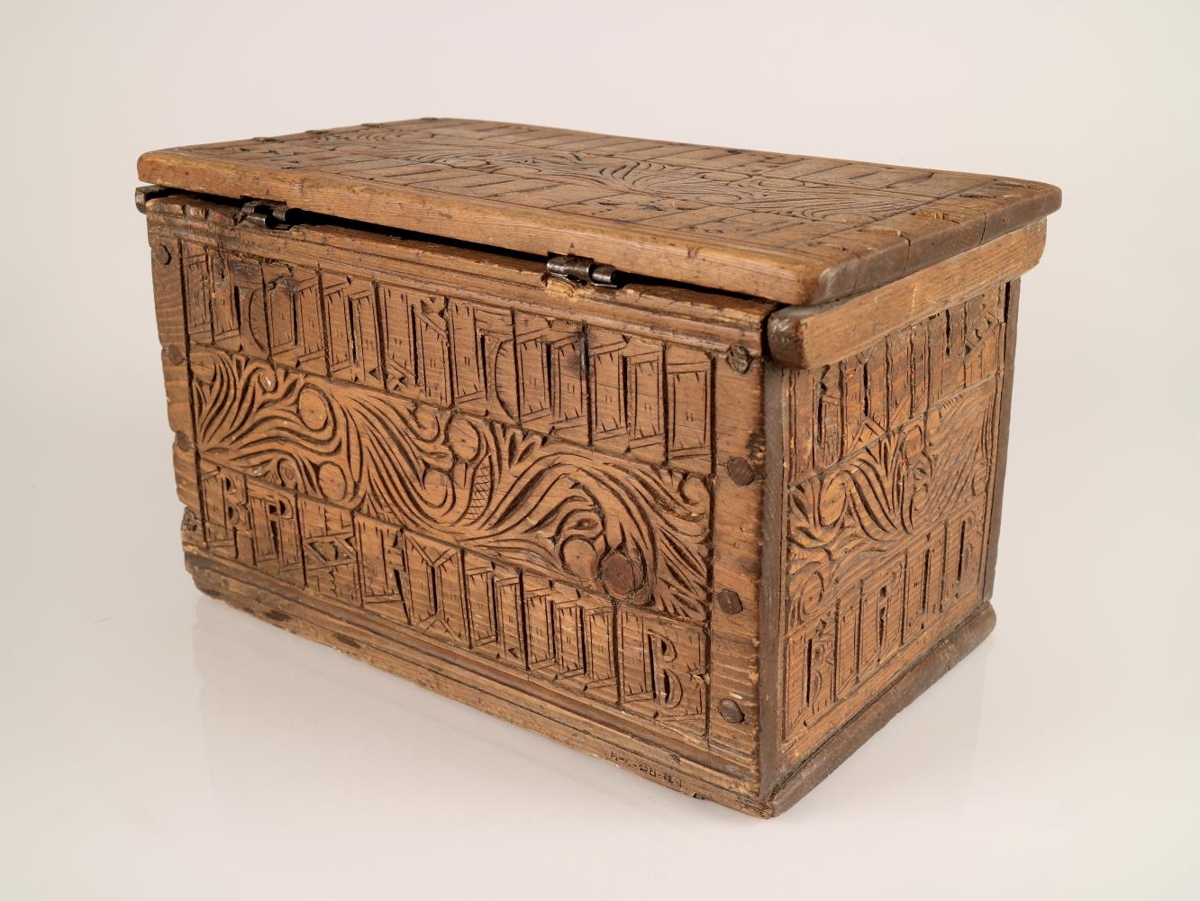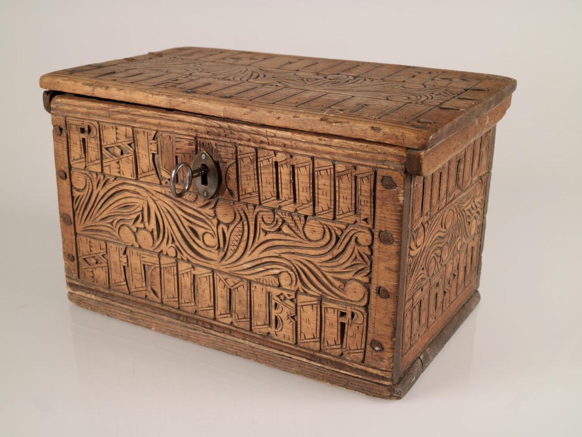 Kistill. Negldur saman með trénöglum, útskorinn á loki, hliðum og göflum og er skurðurinn alls staðar eins, skrautbekkur í miðju og höfðaleturslínur beggja megin. Lamir og skrá úr járni, lykill fylgir. Lamir eru brotnar þannig að lok er laust frá kistli. Lengd: 32,3 cm, breidd: 19,2 cm og hæð: 19 cm.