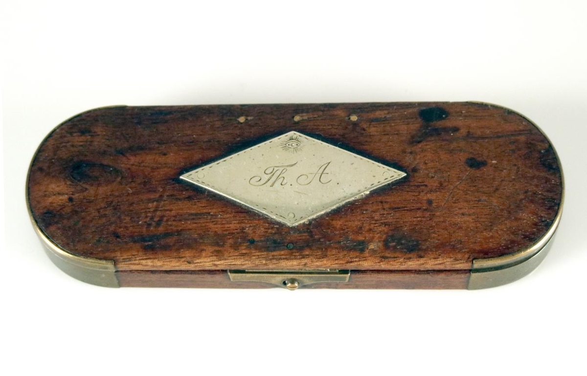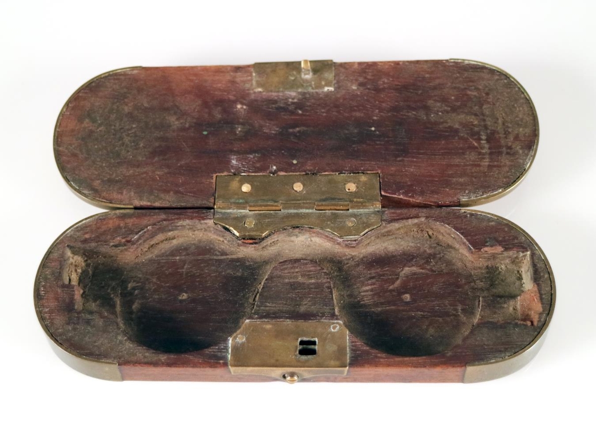 Gleraugnahulstur, án gleraugna. Hulstrið er úr dökkum við með lömum, læsingu og spöngum úr kopar. Hulstrið er skorið út að innan í lögun gleraugnanna sem vantar. Á loki er tígullaga silfurplata sem grafið er í auga og fangamarkið: Th. A., upphafsstafir Tómasar Ásmundssonar sem fyrstur átti gleraugnahulstrið.