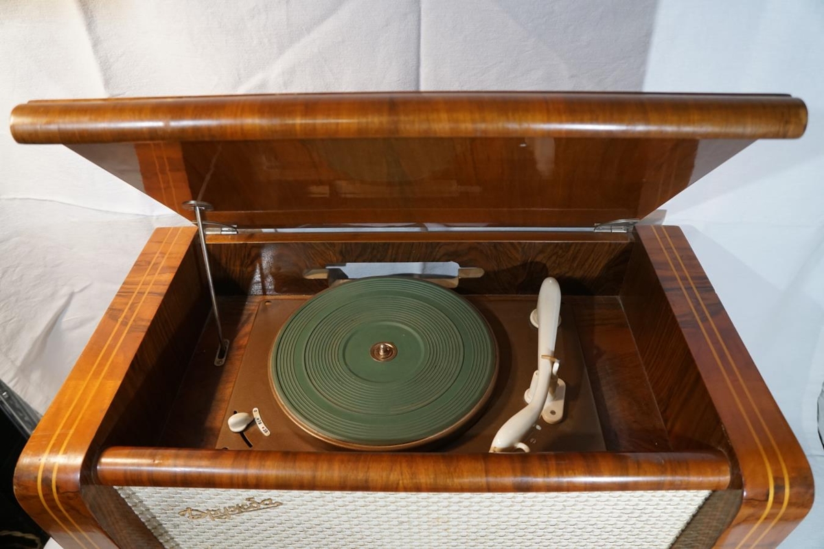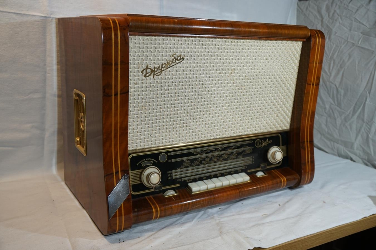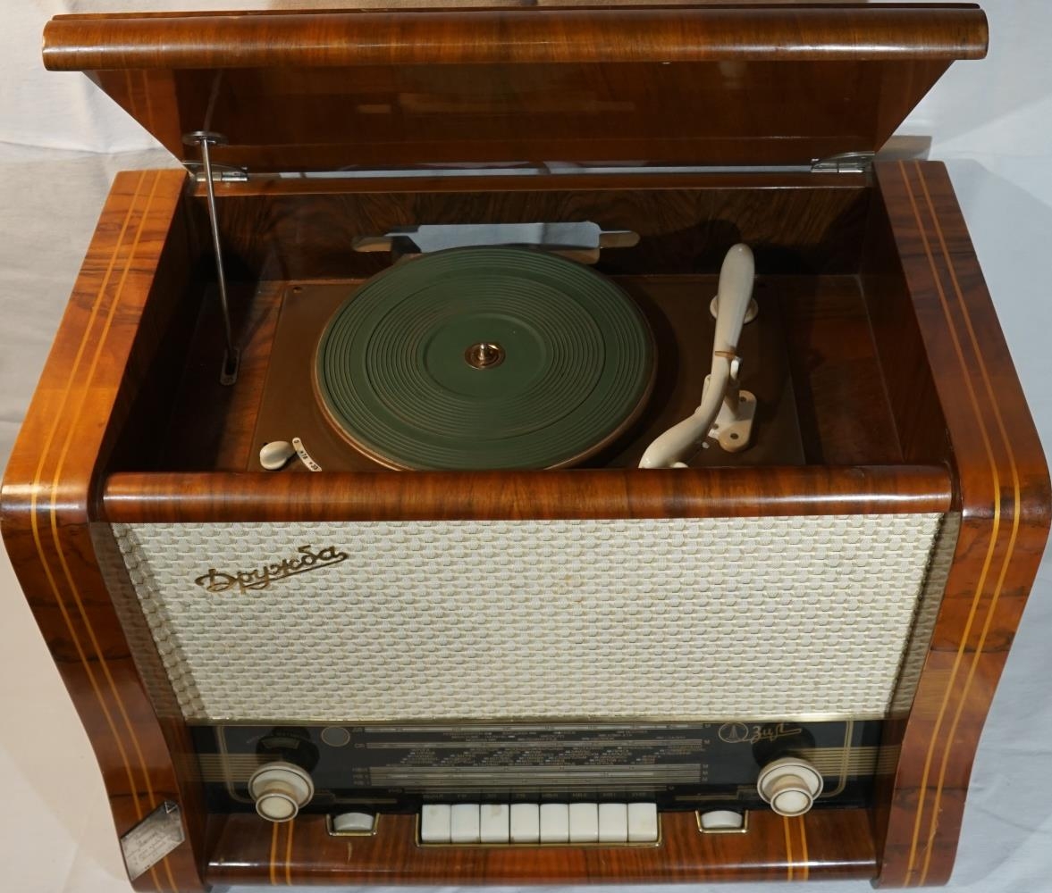 Rúsneskt útvarp með plötuspilara. Framleitt í Lettlandi 1958-1960.
