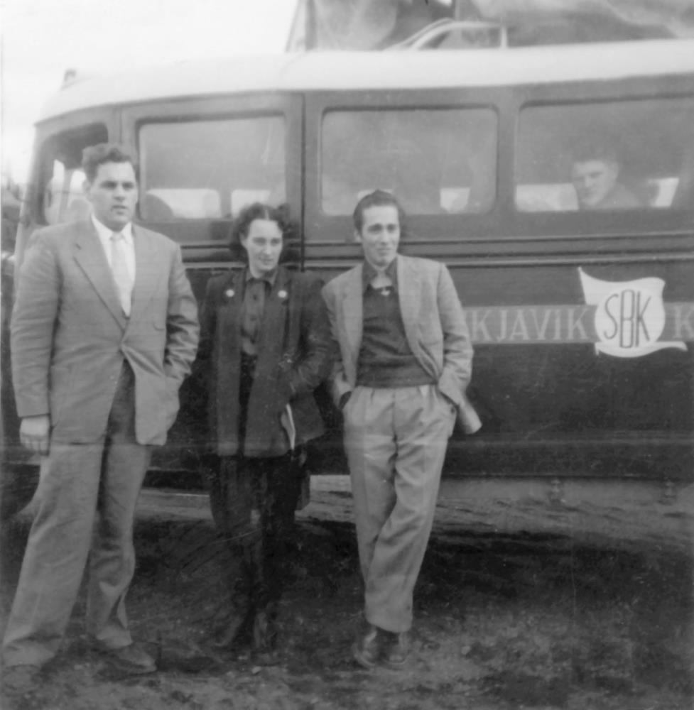 Þorsteinn Gíslason frá Krókvelli í Garði, skólastjóri Gerðaskóla. Halldóra Ingibjörnsdóttir frá Flankastöðum í Sandgerði og Ingvar Ingólfsson, kennarar við Gerðaskóla á skólaferðalagi með nemendum Gerðaskóla.