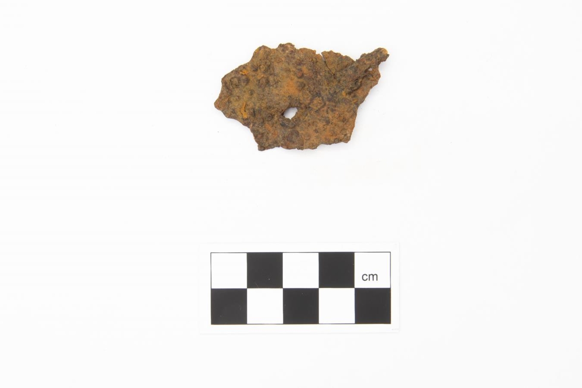 Flöt, þunn járnplata með næstum ferköntuðu gati og titt, tittinum er nelgt í gegnum plötuna. Gripurinn er líklega hluti af bátasmíði á einhvern hátt, hugsanlega sem einhvers konar viðgerð á bát.