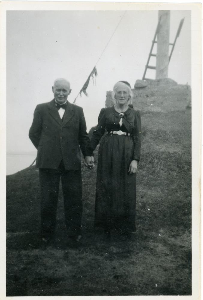 Heldri maður og kona standa og haldast í hendur. Maðurinn er til vinstri, klæddur í jakkaföt og með þverslaufu um hálsinn. Konan er klædd í peysuföt með skotthúfu. Í bakgrunni sést staur í steypuklump á hól.