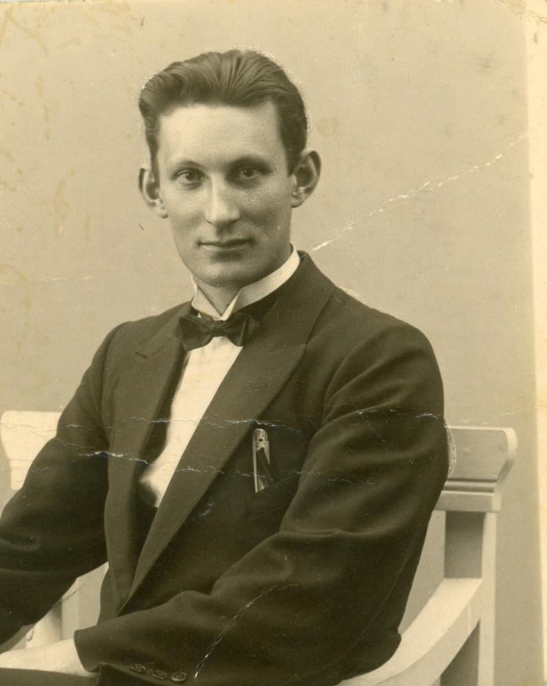 Karlmaður situr fyrir á myndinni, klæddur virðulega í jakkaföt og með þverslaufu. Eitthvað ógreinilegt er í brjóstvasanum hans.