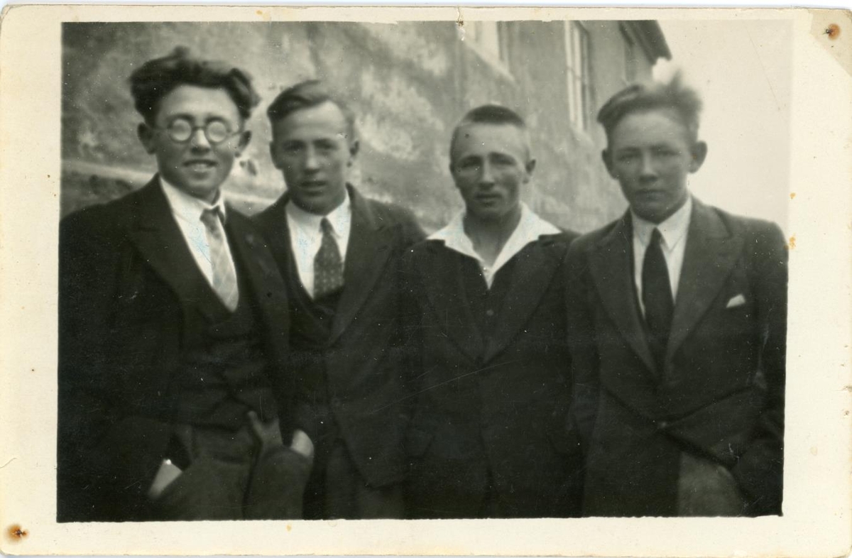 Fjórir ungir menn eru á myndinni, standandi fyrir utan hús. Sá sem er lengst til vinstri er með kringlótt gleraugu. Allir nema næst síðasti til hægri eru með bindi.