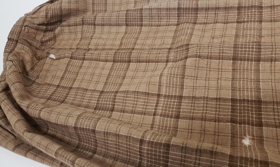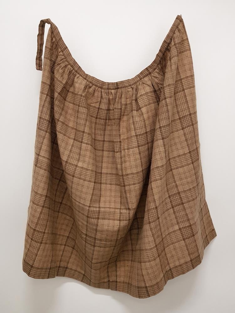 Brúnköflótt upphluts peysufatasvunta. Efnið er götótt á nokkrum stöðum framan á svuntunni. Föt úr búi Sigríðar Þorleifsdóttur. Sigríður Kristín Guðmundsdóttir var kona Ingimars Jóhannessonar kennara í Keflavík. Ingimundur var áður tengdasonur Sigríðar Þorleifsdóttur á Háeyri á Eyrarbakka.