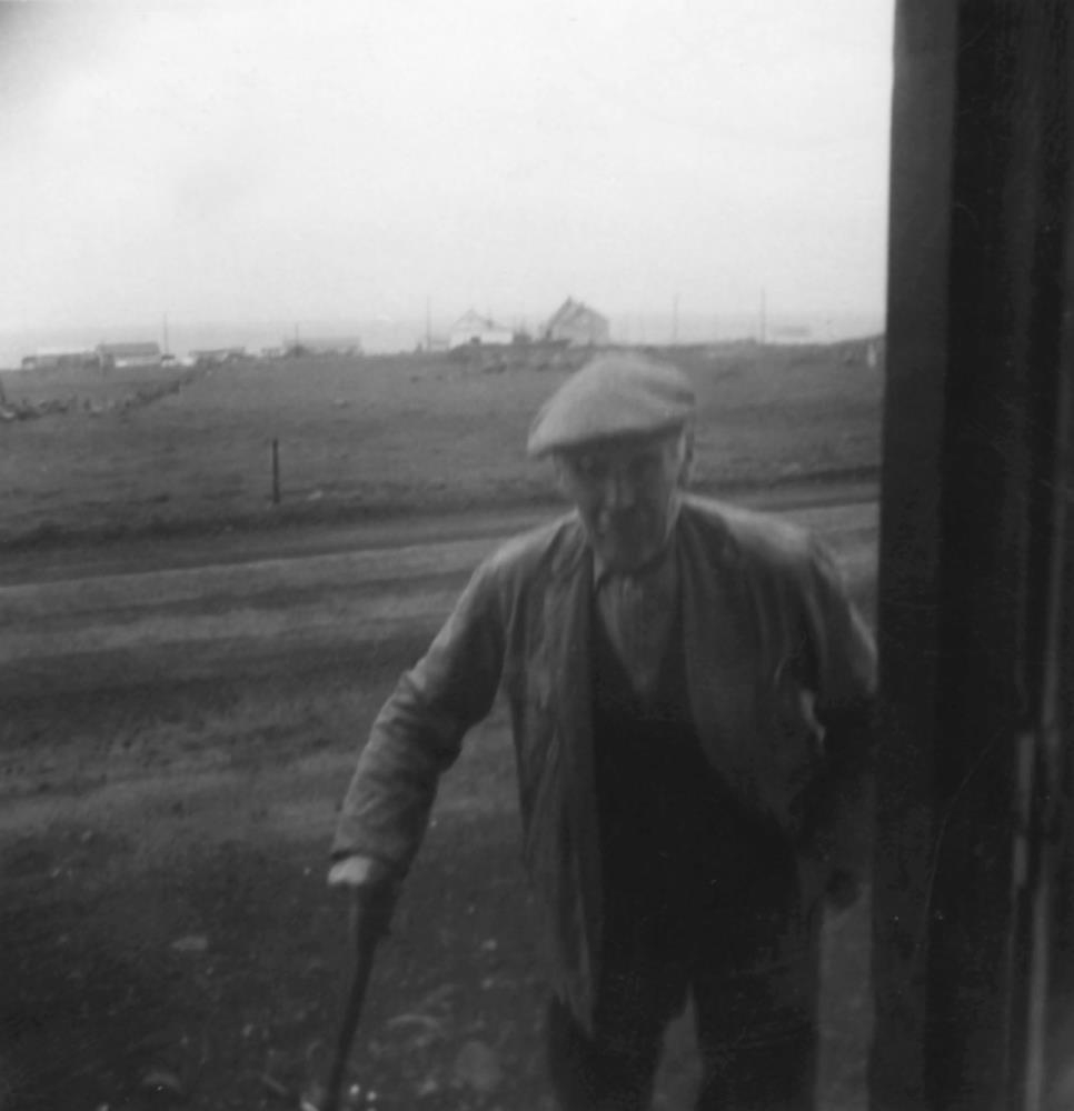 Ingimundur Guðjónsson frá Garðstöðum, stendur líklega fyrir utan dyrnar á Bjargasteini í Garði. Kothús sjást í baksýn.