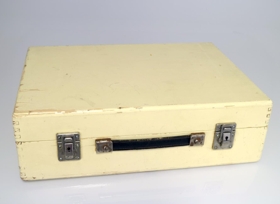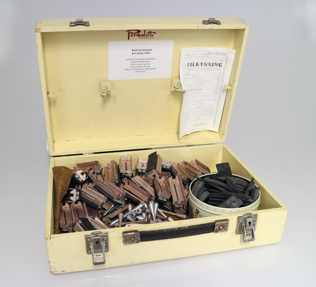 Permanentspólur í viðarkassa, fyrir kalt permanent. Gulur málaður viðarkassi með lamir og læsingu úr málmi og handfang úr leðurlíki. Í kassanum eru 42 bleikar álspólur (7,5x2,5x 2,5 cm) með áföstum gúmmíböndum, ál pinnar (bláir 10 stk., bleikir 28 stk.), 24 klemmur úr áli. Einnig eru 54 gúmmíbönd í tveimur stærðum, 7,5x3 cm (43 stk.) og 7,5x 7 cm (11 stk.) í Mackintosh's sælgætisdós án loks. Á spólurnar er grafið: Permalette, á gúmmíböndum stendur máðum stöfum: Permalette. Innan á loki viðarkakassans stendur: Permalette Machineless, þar er einnig límdur miði sem á stendur:„Kalt permanent frá árinu 1943. Gjöf frá Fjólu Sigmundsdóttur hárgreiðslumeistara, fyrrverandi eiganda hárgreiðslustofunnar Píróla, Vesturgötu 2 í Reykjavík (1940-1952).“ Innan á botni kassans eru för eftir gúmmíbönd, hugsanlega brunaför.