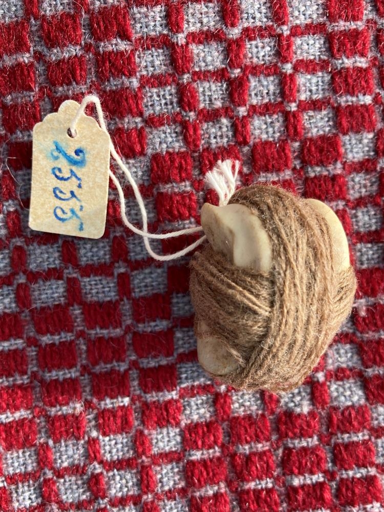 Mórautt þríband unnið af Þorgerði Halldórsdóttur. Er undið upp á kindavölu.