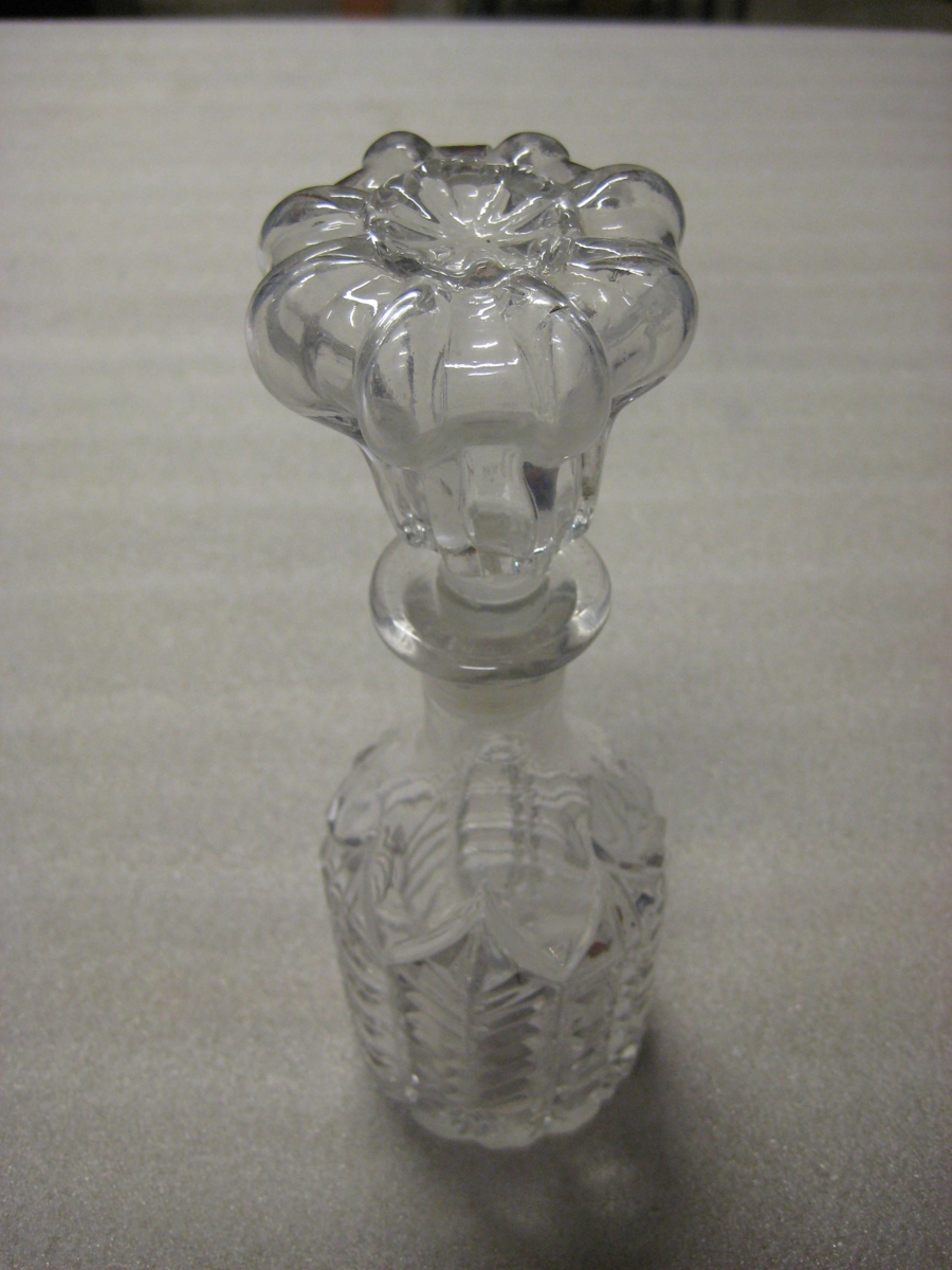 Flaska úr glæru gleri hæð15,0 sm uppá stútbrún, þar í kemur tappi úr gleri. Mikill um sig og skreytt. Brennivínsflaska frá Vatnsnesi í Grímsnesi. Flöskuna átti lengi Loftur bóndi Gíslason í Vatnsnesi í Grímsnesi dáinn árið 1917.
