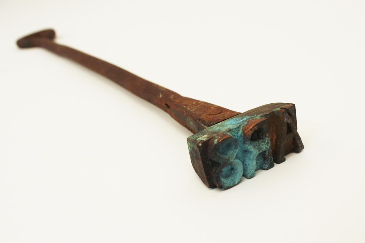 Járnteinn með lykkju á endanum. Á teininn hefur verið fest brennimarkið ÁR 8. Skráð í Sarp 2: "37,0 x 1,0-3,0"