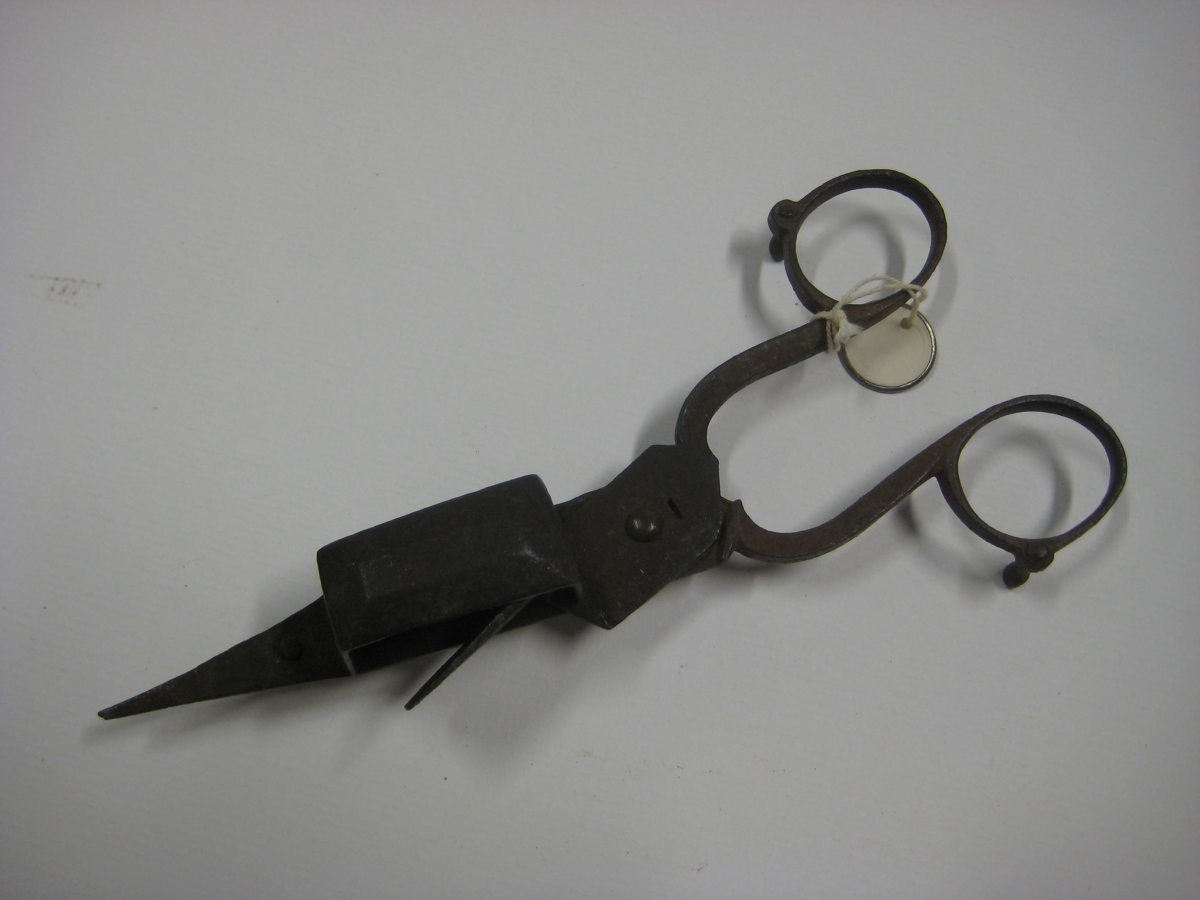 Ljósasöx úr járni með rósalaufi grafið utan á kjálkana. Voru í gömlu Laugardælakirkju í Hraungerðishreppi.