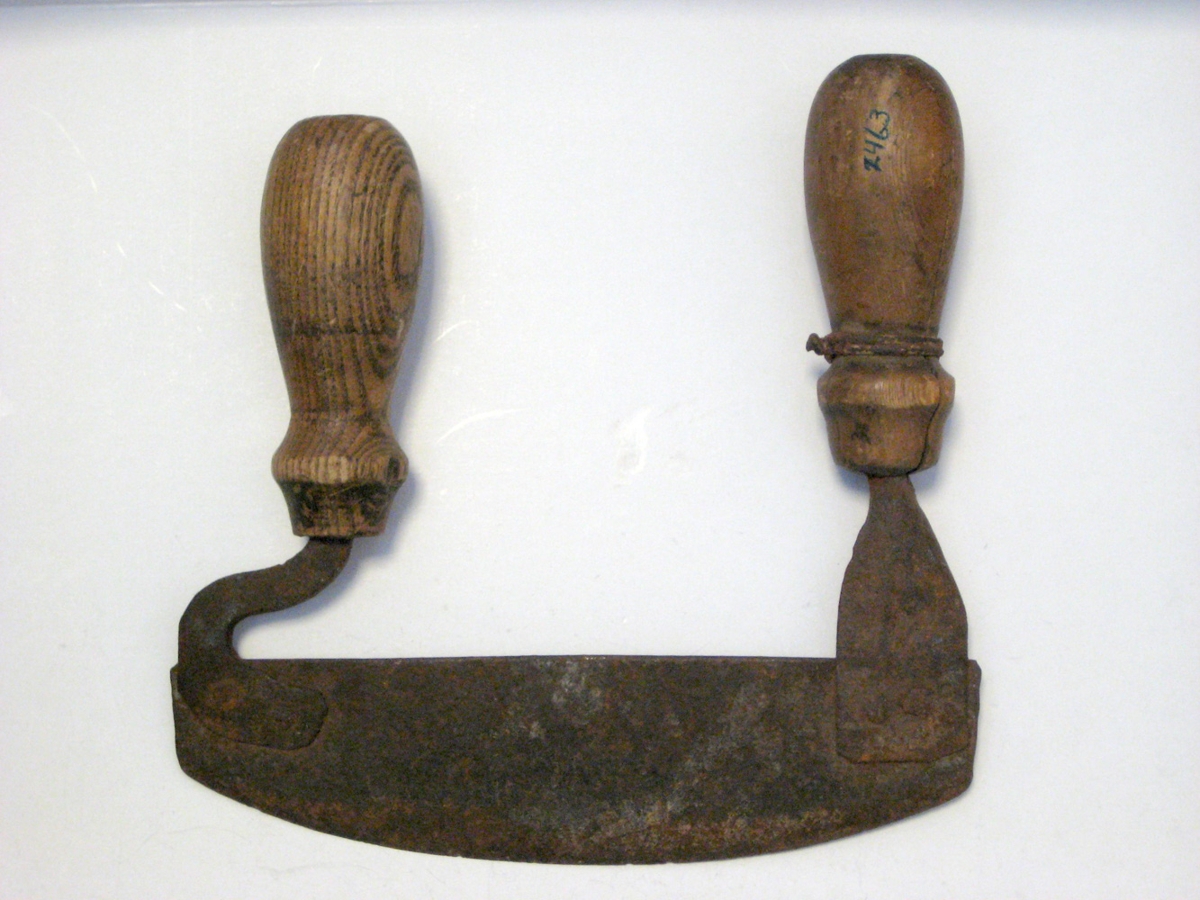 Tóbaksskurðarhnífur með tveimur handföngum. Blaðið þunnt og sköftin hnoðuð á. Sköftin eru ekki eins, annað er „sigðlaga“ en hitt beint. Handföngin úr tré, og annað klofið og haldið saman með vír. Notað af Ólafi Sigurðssyni söðlasmið fyrst á Eyrarbakka og síðan á Selfossi. Gefið af syni hans Guðmundi Geir og börnum hans og Elínborgar Sigurðardóttur, Erlu, Ólafi og Ingunni.