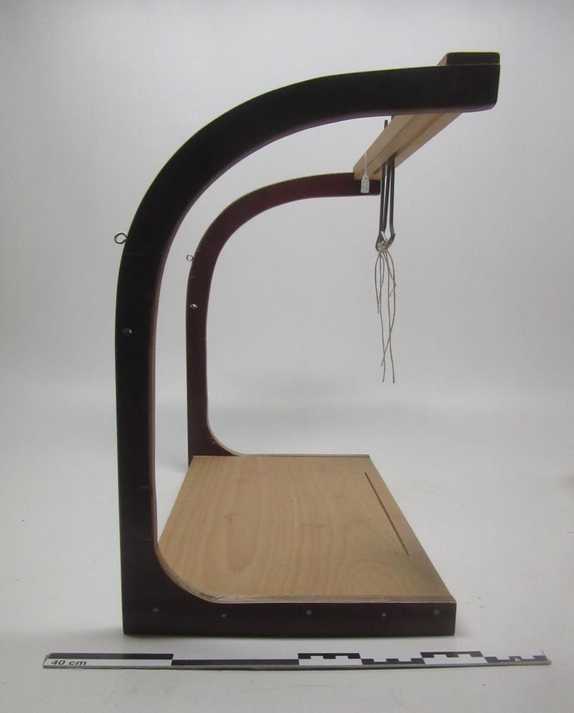 Bókbandsstóll br:51, d:29 h:46,7 cm. Smíðaður úr furu, beyki og brúnum krossvið.