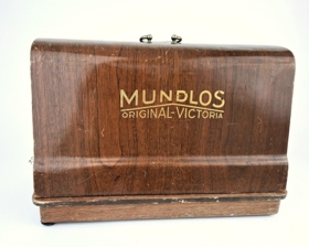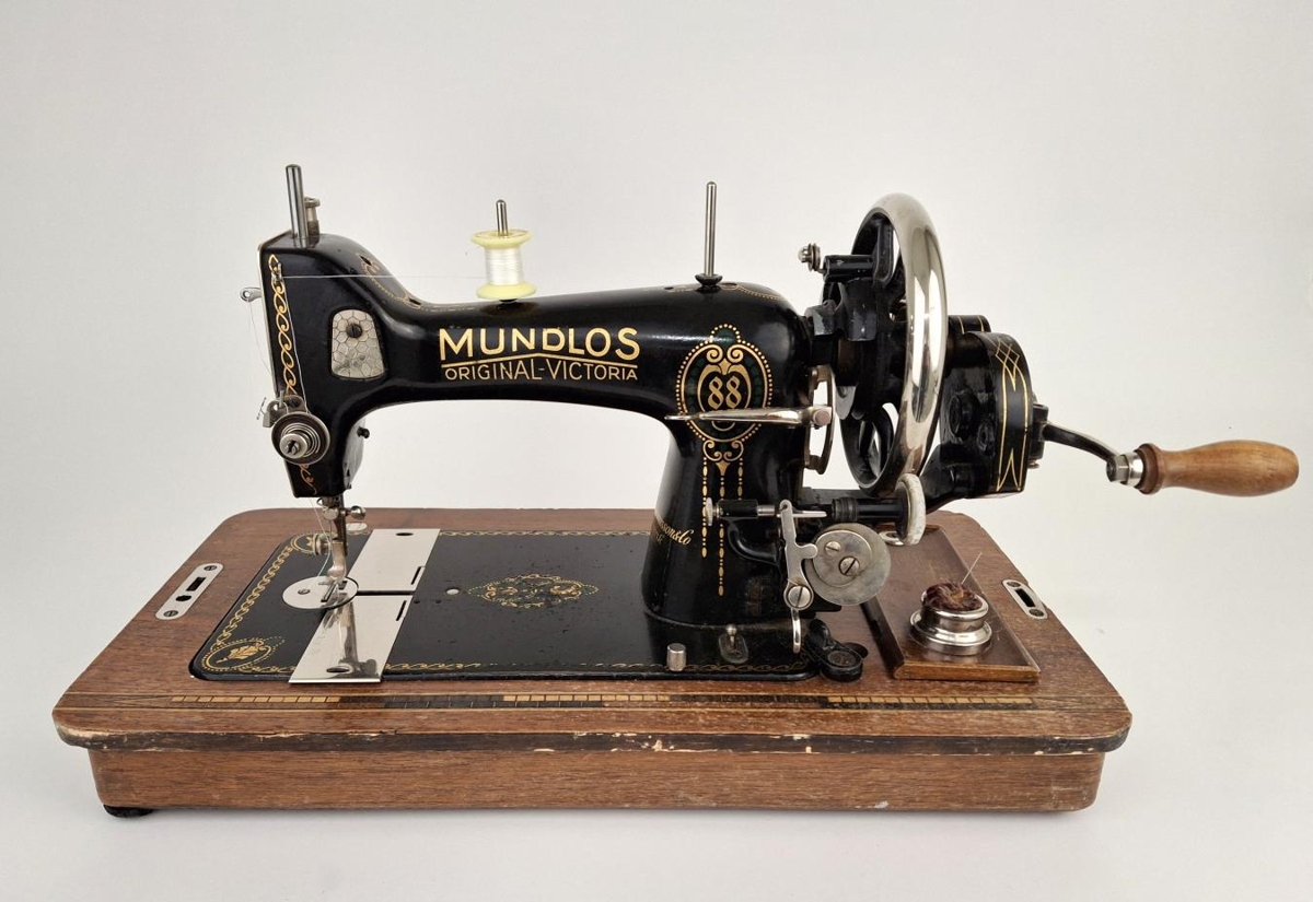 Saumavél MUNDLOS ORIGINAL VIRGINIA. Saumavél svört með gullituðum listum, í brúnum kassa. Handknúin. Lítur mjög vel út, fallegur gripur. Saumavél Ingibjargar Oddsdóttur sem bjó í Bráðræði, á Eyrarbakka dáin 1999.