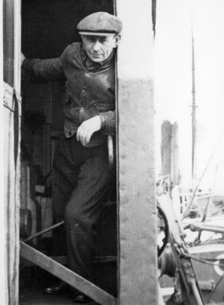 Jóhann Helgason daglaunamaður í dyrum vinnustofu/verkstæðis í Hafnarfirði. Hann er klæddur hefðbundum vinnufötum síns tíma með sixpensara á kolli. Dyrnar eru opnar og eru við horn hússins. Við hlið þeirra er hornið klætt með járni en handan þess eru bílvél og aðrir hlutir sem raðað er á víð og dreif.