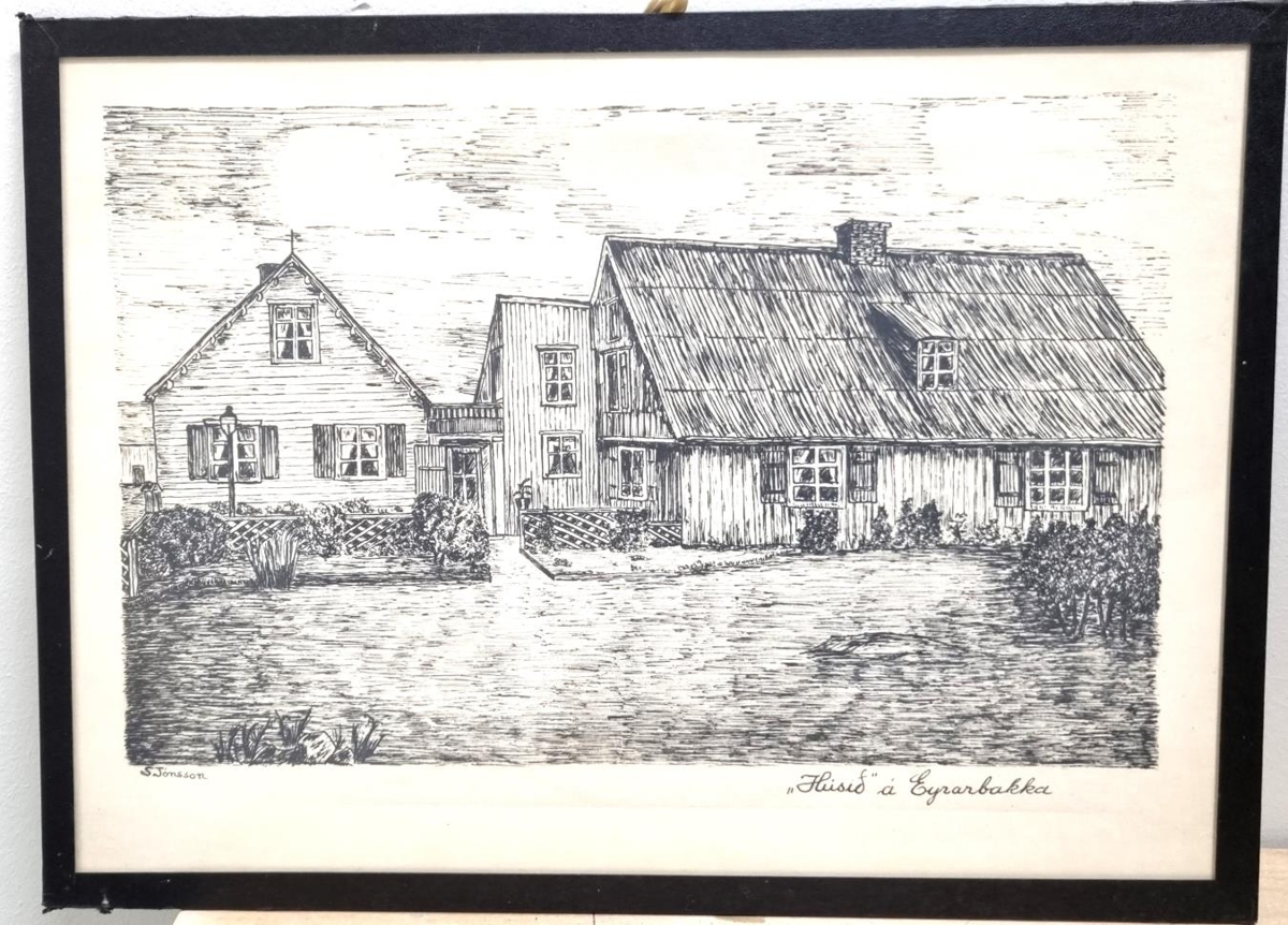 Teikning, fjölfölduð.Teikning Sigurðar Jónssonar "flug" af Húsinu á Eyrarbakka. Úr fórum móður gefanda.