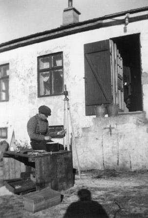 Guðmundur Guðjónsson frá Réttarholti í Garði að setja saman vindmyllu við Réttarholt. Myndin tekin í kringum arið 1940.