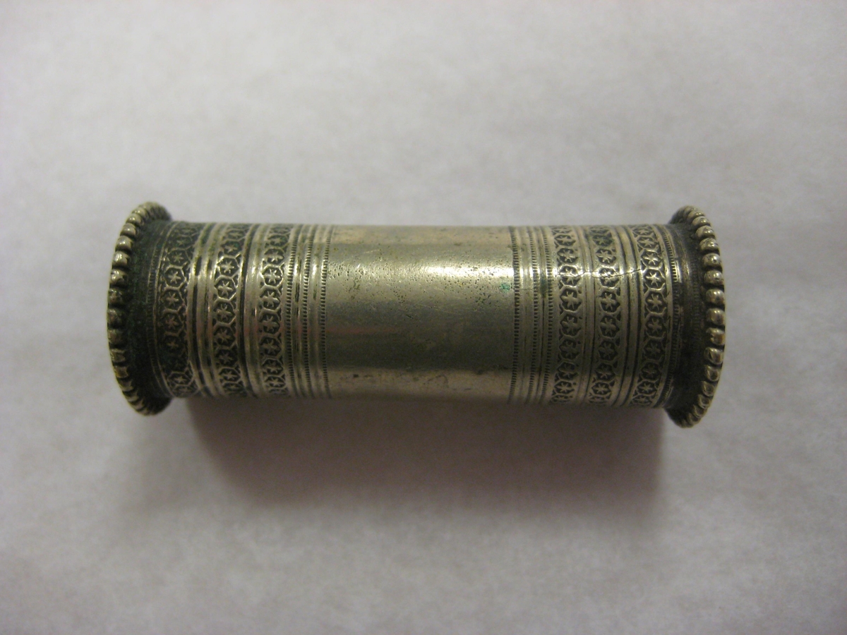 Skúfhólkur með fallegu mynstri til endanna. Var í eigu afkomenda Jóns Árnasonar rokkadreijara á Eyrarbakka, og gefandi er afabarn hans. Smíðað af Jóni eða Oddi Oddssyni silfursmið í Reginn á Eyrarbakka.