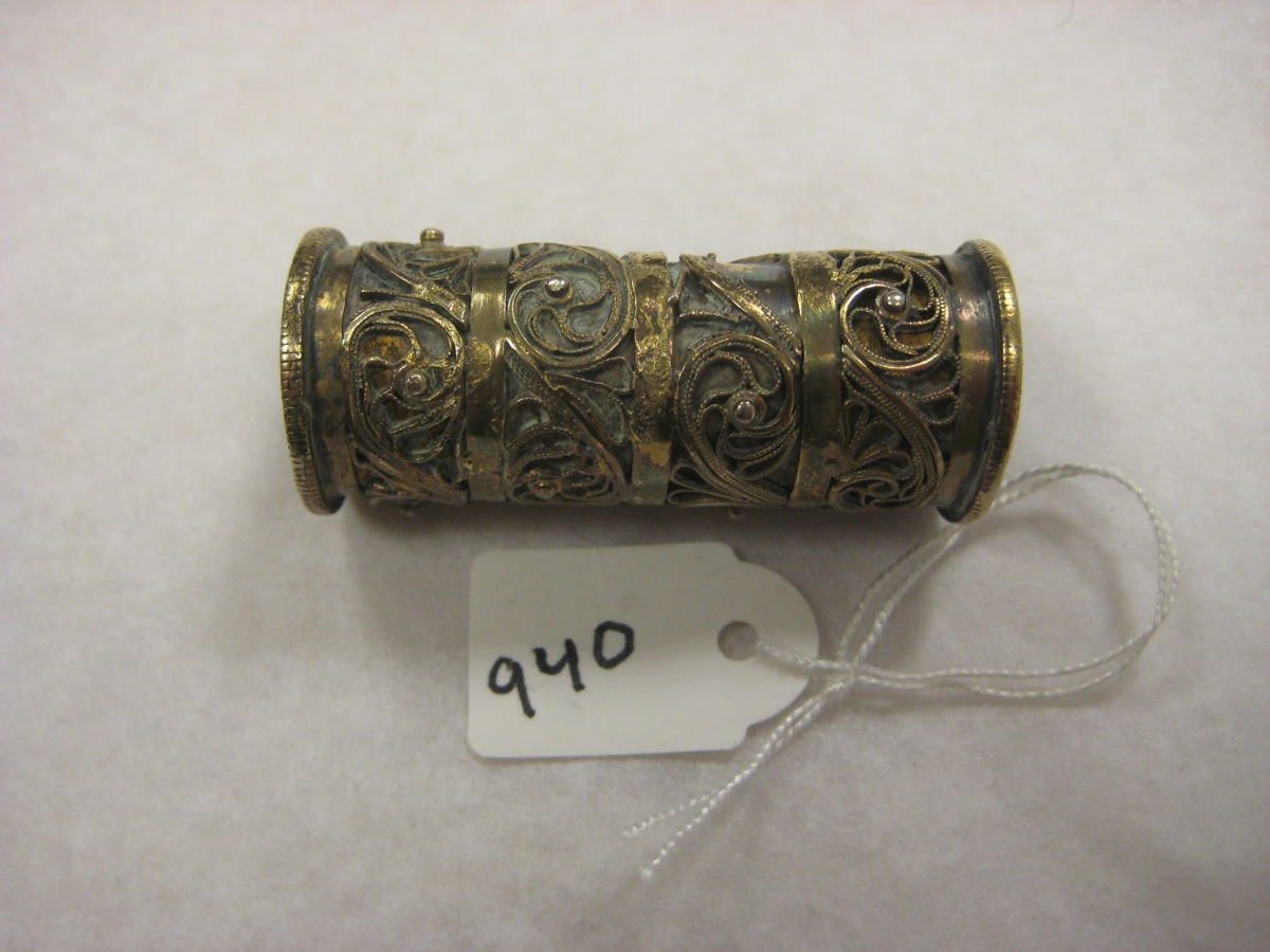 Skúfhólkur Valgerðar ljósmóður. Hólkurinn er 4,5 sm á lengd og 2,0 sm á vídd barmabrúna. Margbrotið og skrautlegt verk, talið smíðað af afa Valgerðar Jóni Sigurðssyni silfursmið á Bíldsfelli í Grafningi.
