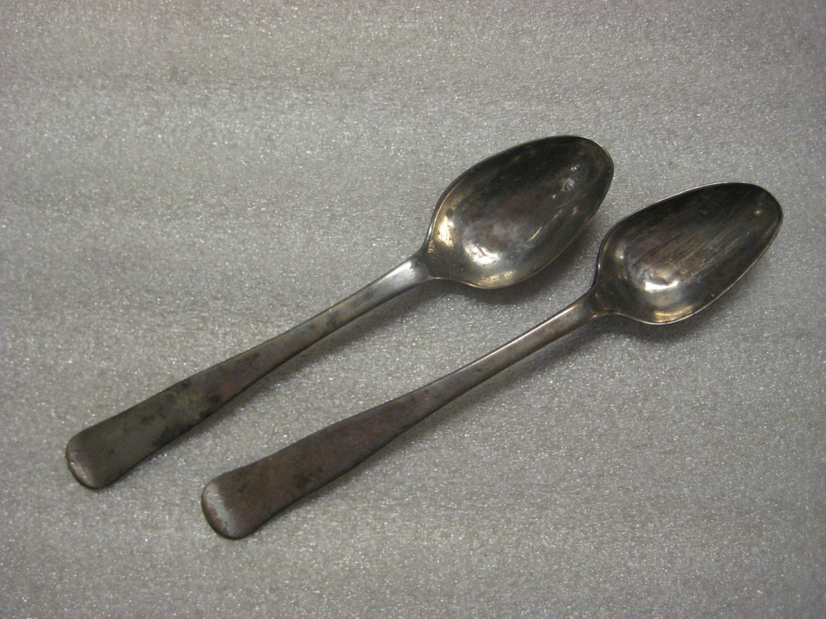 Teskeiðar tvö stykki úr silfri, smíðaðar af Ebenezer Guðmundssyni á Eyrarbakka. Smíðastimpill hans er aftan á sköftunum Eb.G.