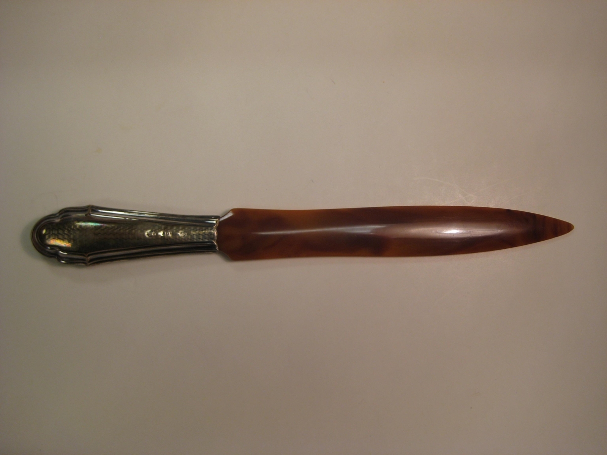 Bréfahnífur með silfurskafti og hnífsblaði úr brúnu plasti (viðarlíki). Á skaftinu má sjá skamstöfunina H.Gr. sem gæti verið kennimark smiðsins. Úr fórum Arons Guðbrandssonar, gefandi er Jakob Sigurðsson Garðatorgi 7 í Garðabæ.