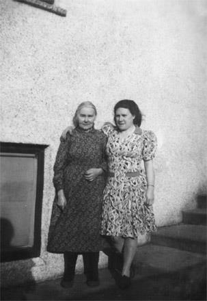 Við Skeggjagötu 19 í Reykjavík. Þar bjuggu hjónin Guðni Guðmundsson og Þóranna Guðjónsdóttir frá Réttarholti í Garði. Frá vinstri: Friðgerður Guðmundsdóttir frá Kaldbak, fóstra Guðna Guðmundssonar og Svanhildur Ólafía Guðjónsdóttir, systir Þórönnu Guðjónsdóttur. Myndin tekin um árið 1950.