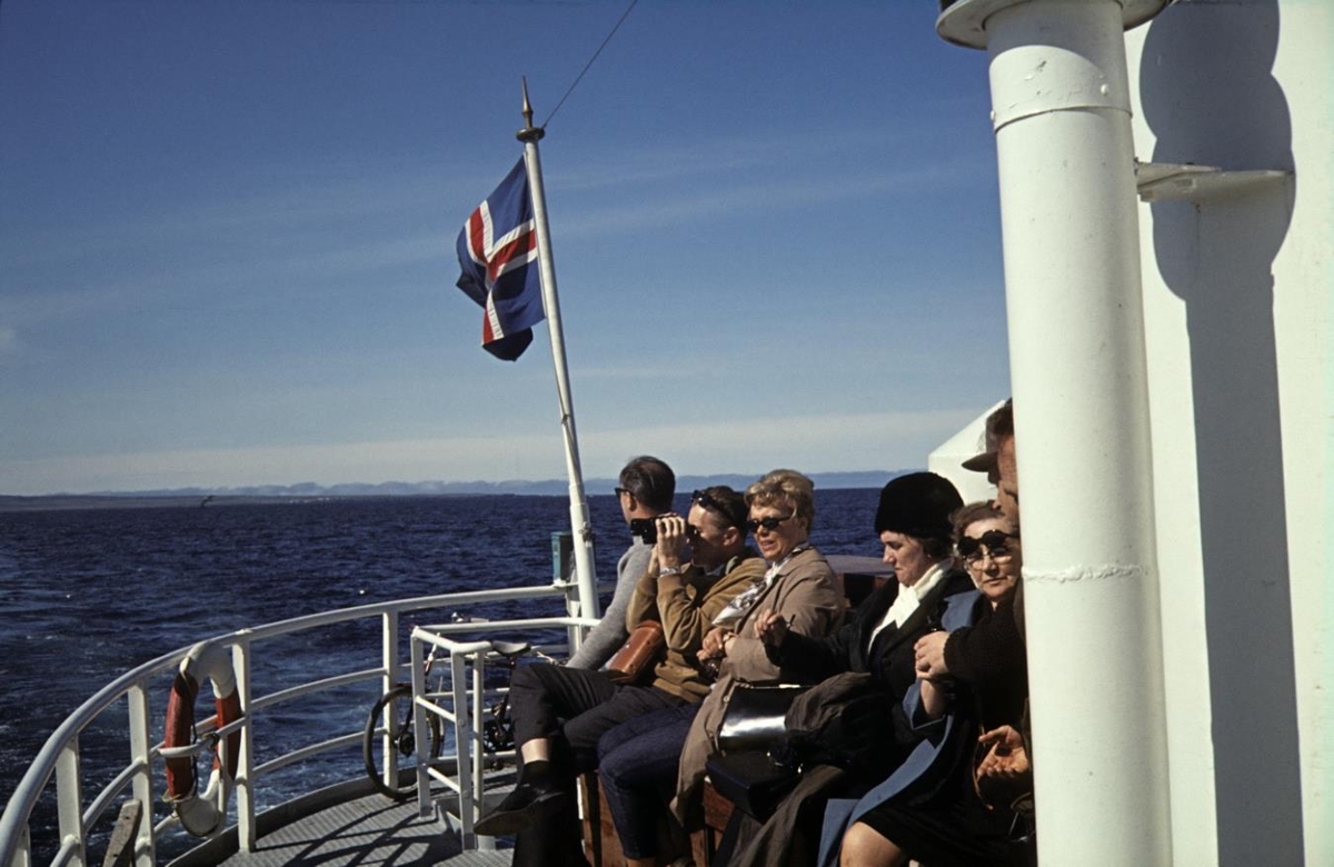 Breiðafjörður. Ferðfólk um borð í ferju. Maður með kíki. Um borð í Baldri. 1968