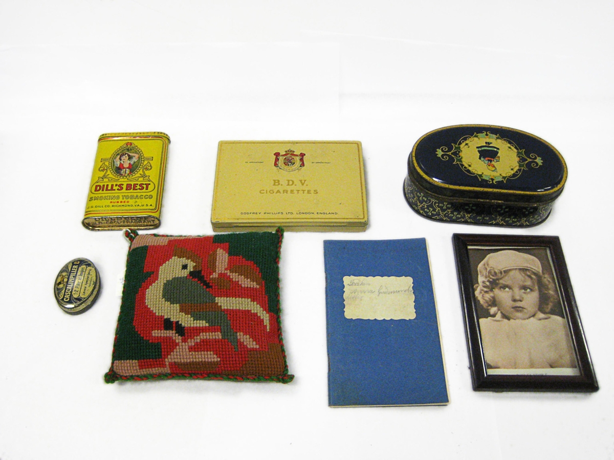 Rauðmálaður trékassi með ýmsu smálegu. 2959 A: Lítill púði með krosssaumi á annarri hlið. 2959 B: Umslag með jólakortum til Önnu G. 2959 C: Umslag með jólakortum til ýmissa í Arabæjarhjáleigu, 2959 D: Blikkdós samskonar en minni og BÁ: 2948, 2959 E: Shirley Temple í brúnum tréramma, 2959 F: Skrifbók blá kápa, 2959 G: Vindlaaskja með jólakortum til Sigríðar Guðmundsdóttur, 2959 H: átta stílabækur Sigríðar Guðmundsdóttur, 2959 I: CASCALINPILLER, 2959 J: DILLS´S BEST SMOKING TOBACCO. Úr eigu Önnu Guðmundsdóttur sem fædd var í Arabæjarhjáleigu í Gaulverjabæjarhreppi árið 1933 en fluttist 5 ára til Reykjavíkur. Hún gaf í maí 1999 ýmsa muni úr hennar barnæsku, einnig gripi frá foreldrum hennar, ömmu og systkinum. Þessi kassi var í eigu Önnu.