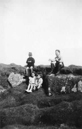 Systkinin Eiður Svanberg, Ingigerður Þórey og Guðmundur Brynjar Guðnabörn og Rúnar Guðmundsson frá Réttarholti í Garði inn við Kastala svo nefndan, nálægt Réttarholti um árið 1946.