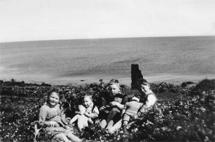 Systkinin Eiður Svanberg, Ingigerður Þórey og Guðmundur Brynjar Guðnabörn og frændi þeirra, Rúnar Guðmundsson frá Réttarholti í Garði að leika sér úti í náttúrinni við Réttarholt, um árið 1945.