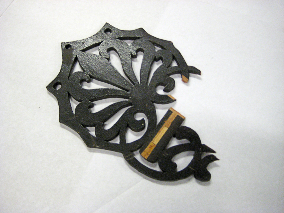 Útskorinn platti, rósaskorinn. Málaður dökk brúnn, stykki í miðjunni með tveimur götum. Plattinn er brotinn.