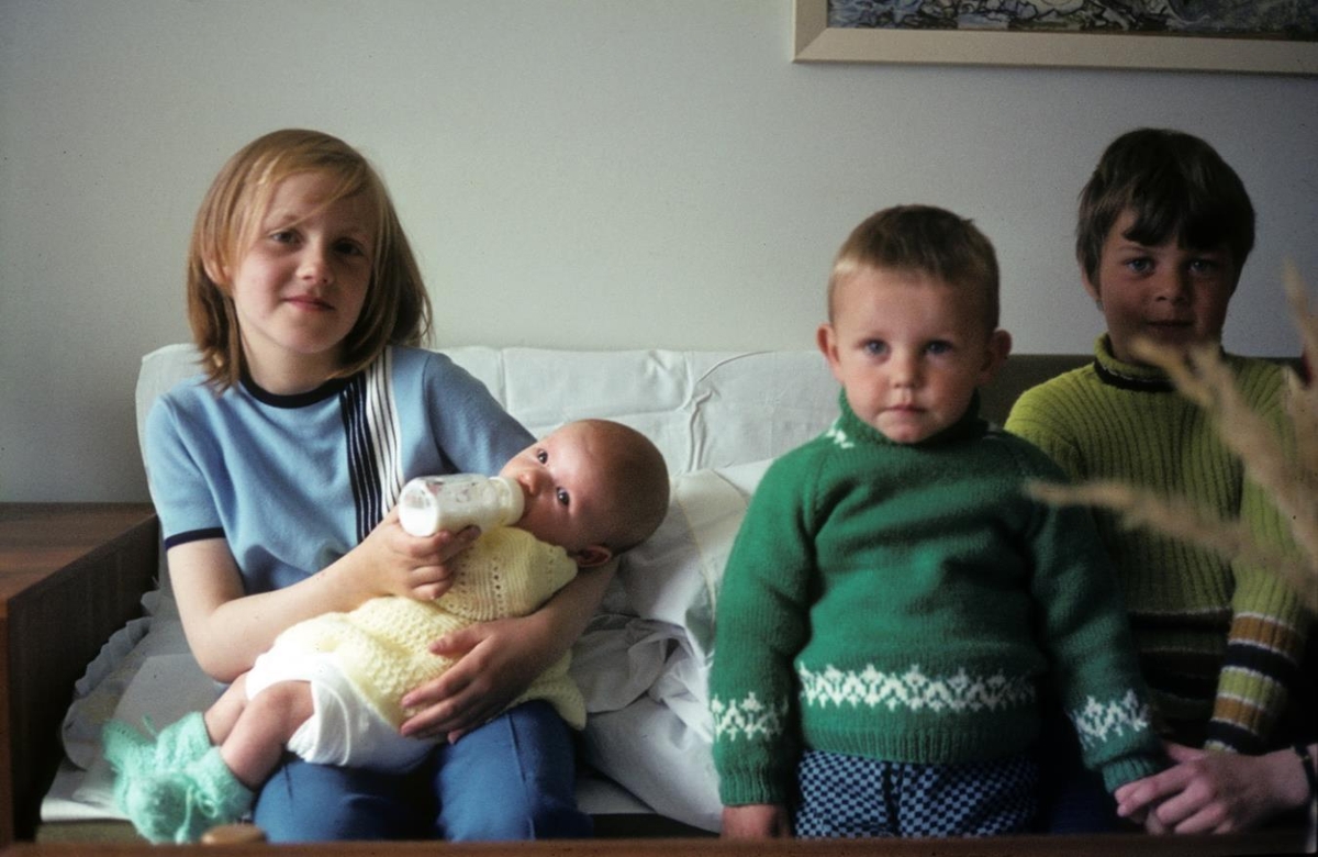 Skálholt 17. Ólafsvík. Krakkar í sófa, stelpa með barn í fangi að gefa pela. Svanfríður með Víglund Pétursson, óþekkt, Sigrún Sævarsdóttir. Svanfríður var barnapía hans sumarið sem hún var 9 ára.